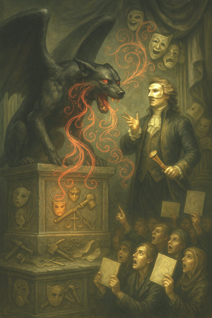 Thus, the matrix of Glasya-Labolas rests on two pillars. The first is the need for support, “a chain,” which gives the watchdog a sense of security: the sigil of Kaasimolar depicts a war chariot or elephant; his aggression needs support — just as a physical chain is needed by a “serving” dog. In the psyche this manifests as reinforcement from external attention, without which “protective” wrath fades. It is the same as with a dog’s aggression — once you open the gate or remove the chain, it calms down. The second is nourishment from “demons of eloquence” and “glamour”: a society built on masks and demonstrativeness inevitably encourages forms where the form of speech is primary and meaning and presence are secondary; in such an environment inflicted pain is easily declared an ethical procedure and an “official duty.”