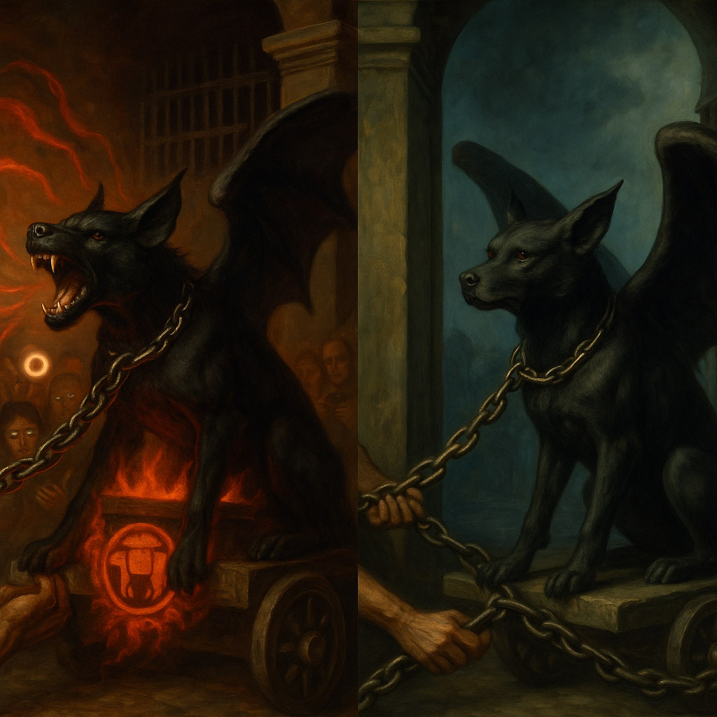 The dog, however, does not burn — it bites and holds. His cruelty is not hot, but “sanctified”; he is a manifestation of Alastor, the executioner of moral order, whose pain is justified by “security” and “justice.”