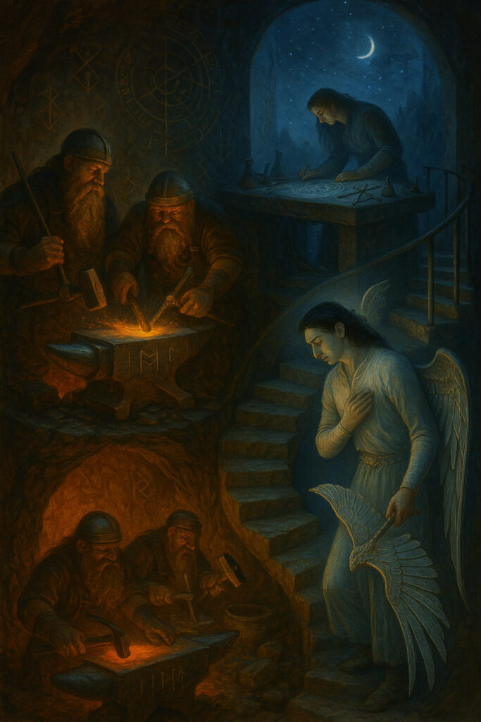 In general, the distinction among the three “earth” peoples can be described as follows: svartalvs/dvergar are bearers of form-giving craft and oath-bound technologies; gnomes are the Earth itself at work, without artifacts and guilds; kobolds/koblins are beings who maintain order in the depths, intermediaries between the layer and the human.
