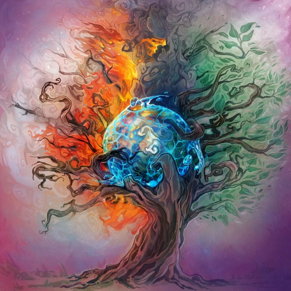 Ideas of a ternary structure of the world (“upper”, “middle” and “lower” worlds, corresponding to spirit, medium and being) found expression in the Near Eastern concept of three primary elements. The ancient inhabitants of the Near East (the Sumerians and the Semites) regarded the world as the result of the impact of spirit on matter. This was first described as the marriage of Heaven (An) and Earth (Ki), Creator and Created, with Wind (Lil) acting as their son and the connecting link. Thus the first ternary concept arose: the Creative Impulse (fire), Generation (earth) and Continued existence (wind). Here fire was understood as the presence of creative force in being, earth as the potential foundation that gives birth to reality, and wind as the manifest, mobile aspect of existence. In fact it is in the “air” that all worldly reality unfolds, and in it all living creatures dwell. In other words, from this point of view everything we see in the manifested cosmos is “the play of the wind,” and in that sense the notion of “lil” is identical to the later alchemical term “salt” as a designation of all actual materiality, and the notion of “to exist” proves identical to the notion “to breathe.” At the same time water was perceived as a manifestation of the primordial forces: the Heaven’s life‑force on earth appears as fresh, sustaining water (Enki), while the Earth’s deep foundation that provides the medium for existence but is unfit to drink appears as the saline waters of the subterranean primal ocean — Abzu.