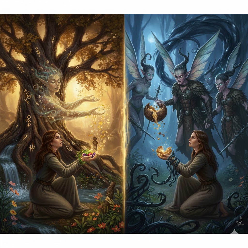 The main thing that fairies expect from people is a proper understanding of their nature and respect for boundaries. Therefore, when meeting them, it is important to avoid names (both your own and the interlocutor’s), do no harm to nature, and demonstrate creativity. And fairy gifts are intolerant since they consider it ‘payment’ or ‘bribery’, and they do not tolerate market relationships, only free exchanges, so instead of gifts, a contribution to nature (clearing a stream, picking up trash, etc.) would be more valuable to them.