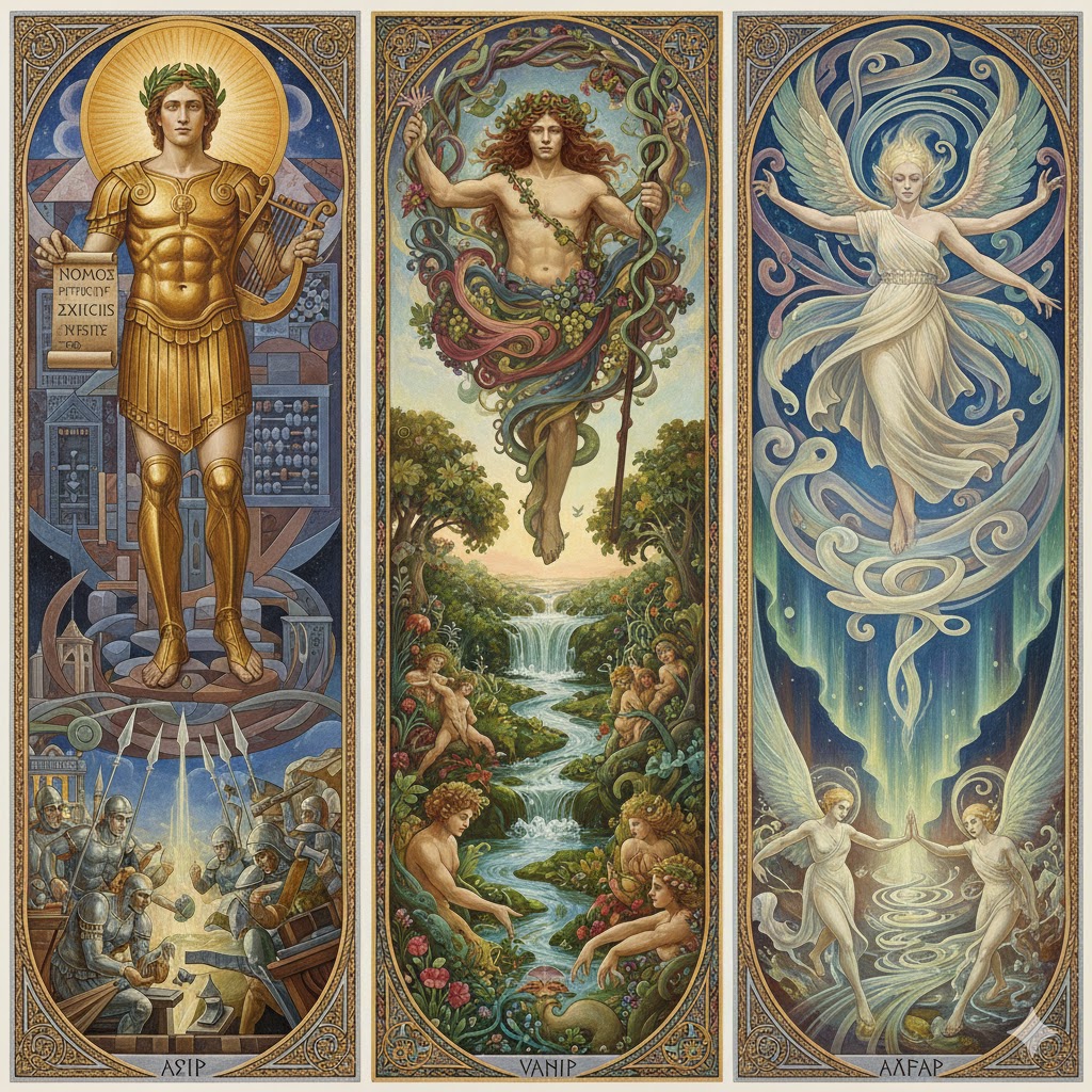 Thus, the overall picture becomes tripartite: Apollo (nomos/counting), Dionysus (the living continuum), and faerie flow-ness (krus — a living form irreducible to reason or to affects) constitute three independent first principles, reflected in the three types of the creative forces of the universe — among the Aesir, the Vanir, and the Alvs.