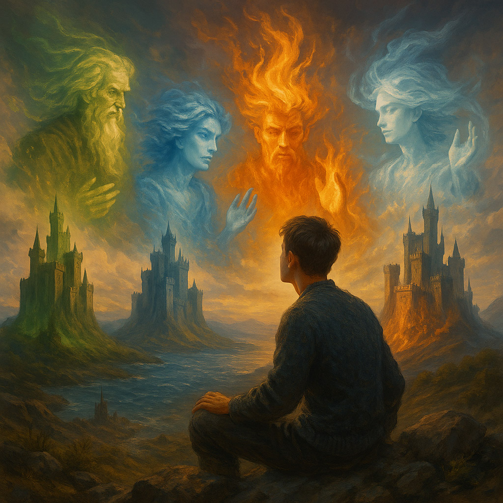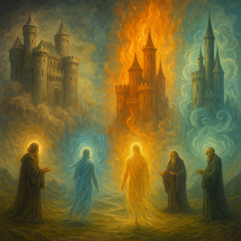 Each City is an element gathered into a polis: the inertia of Earth, the fluidity of Water, the vertical movement of fire, and the horizontal movement of air — each populated by its own elementals. Thus Falias holds form and truth (earth, gnomes), Murias dissolves knots and sees depths (water, undines), Finnias inspires and purifies (fire, salamanders), Gorias lightens and lifts mind (air, sylphs). In the terms of the Interworld, these are spaces built from pure properties, and that is precisely why it is easier within them to align the Castles of the alves (and the sidhe) with the “distilled” flows of reality, to build them as pure and harmonious structures.