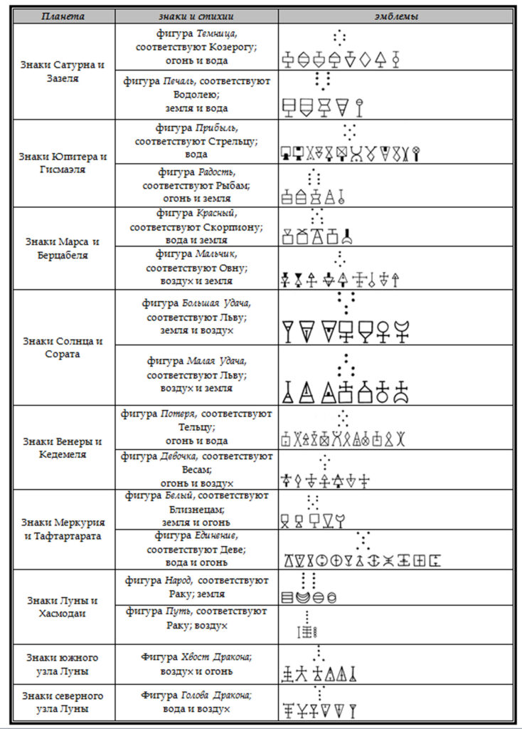 To determine such “compositional completeness”, special symbols were developed — “telesmatic emblems”, formed from geomantic figures by connecting their points with lines. Quite a few such symbols are known, and they correlate with the elements, planets, and zodiac signs: