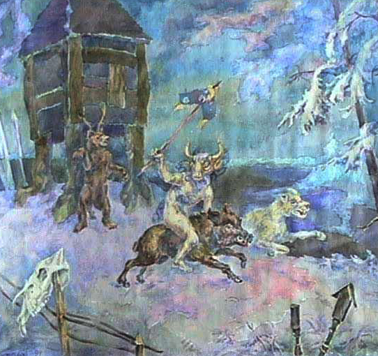 In winter Veles’s power merges with the cold winds of the Lower worlds, ice and frost, allowing rest and recovery to the inhabitants of the Middle World. In summer Veles pours his strength into the Solar stream from Dazhdbog, creating support for the Upper worlds, which pour Yar across the earth.