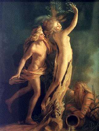 Like other youthful gods, Apollo refused to marry. He is not prone to casual affairs and is usually too absorbed in the goal before him to be distracted by women. His first love was Daphne — yet, because of Eros, love did not bring happiness to the sun god. Apollo mocked Eros, asserting that the god of love could not shoot straight. Angered, the god of love shot a golden arrow of desire into Apollo’s heart and a leaden arrow of aversion into Daphne’s. Consumed by passion, Apollo pursued Daphne, and when he was about to overtake her she cried out to her father, the river god, who turned her into a laurel tree. Yet Apollo’s love for Daphne did not die. The laurel became his sacred tree, and a wreath of its branches adorned the god’s head.