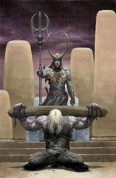 The Aesir tied Loki with his own son’s entrails to a rock after he created a quarrel in Ægir’s house. Above his face, the Aesir hung a snake, whose venom drips into his mouth. Skadi, feeling pity for him, placed a massive bowl underneath, into which the venom flows. When the bowl overflows, Skadi takes it away, but the venom tortures Loki so much at that time that he writhes, causing earthquakes. Loki’s release will herald the beginning of Ragnarök.