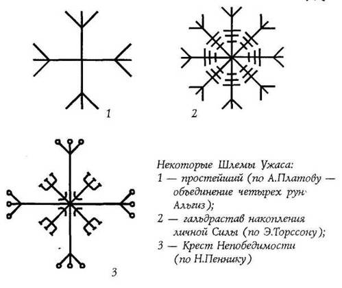 Thus, Aegis-helms protect their bearer because they instill in any attacker a feeling of dread. In other words, the impulse of aggression coming from the attacker is transformed by the Aegis-helm and redirected at the aggressor, instilling fear. In short, the task of these symbols is to suppress the opponent’s will.