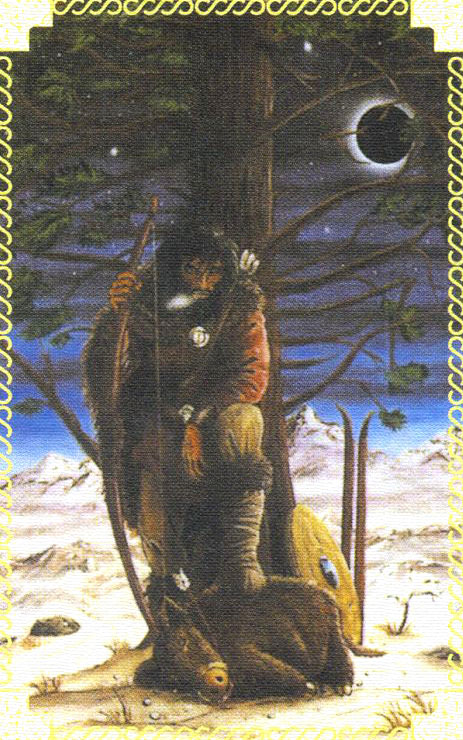 Another aspect of the rune Eihwaz is the notion of the hunt (the best bows are made from yew) in the broadest sense — both as procuring sustenance and as tracking down problems, shortcomings, and enemies (external and internal), and also as the hunt for power. In this aspect Eihwaz corresponds to the god Ullr and the huntress Skaði, who correspond to Hœnir and Heimdall.