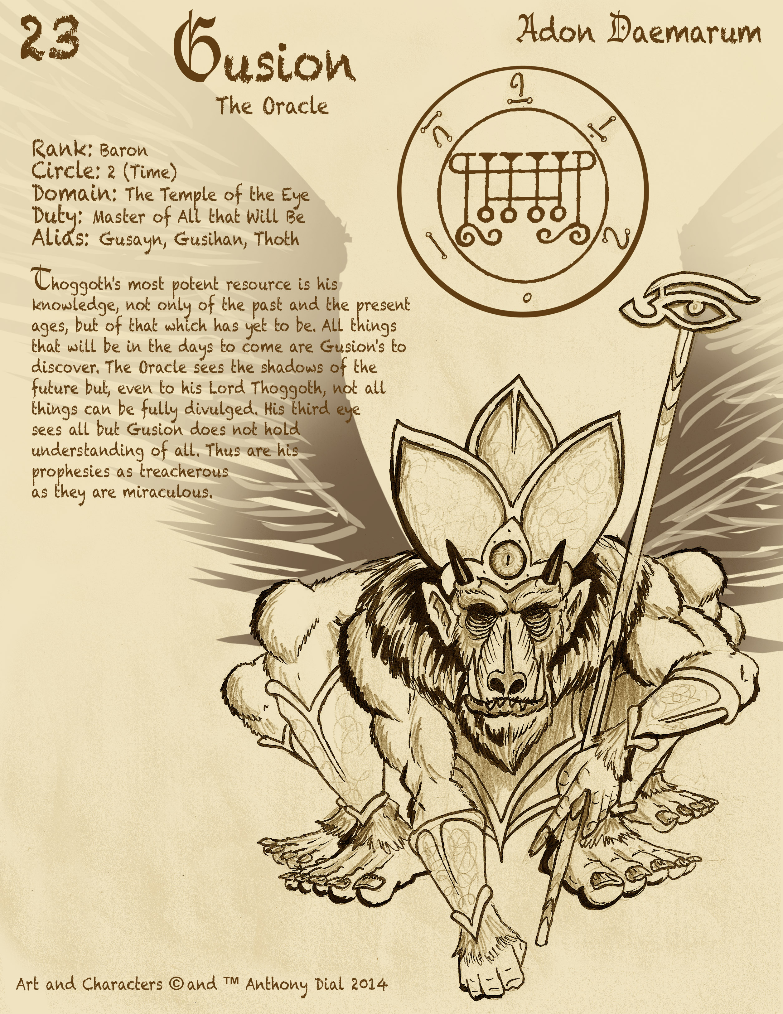“Gasion (Gusion) — the eleventh spirit, a duke. He is like Xenopilus. He tells everything about the present, the past and the future. He can show the solution to any question you ask him. He inclines to friendship and destroys it, and also gives honor and greatness to anyone. He rules more than 40 legions of spirits.”