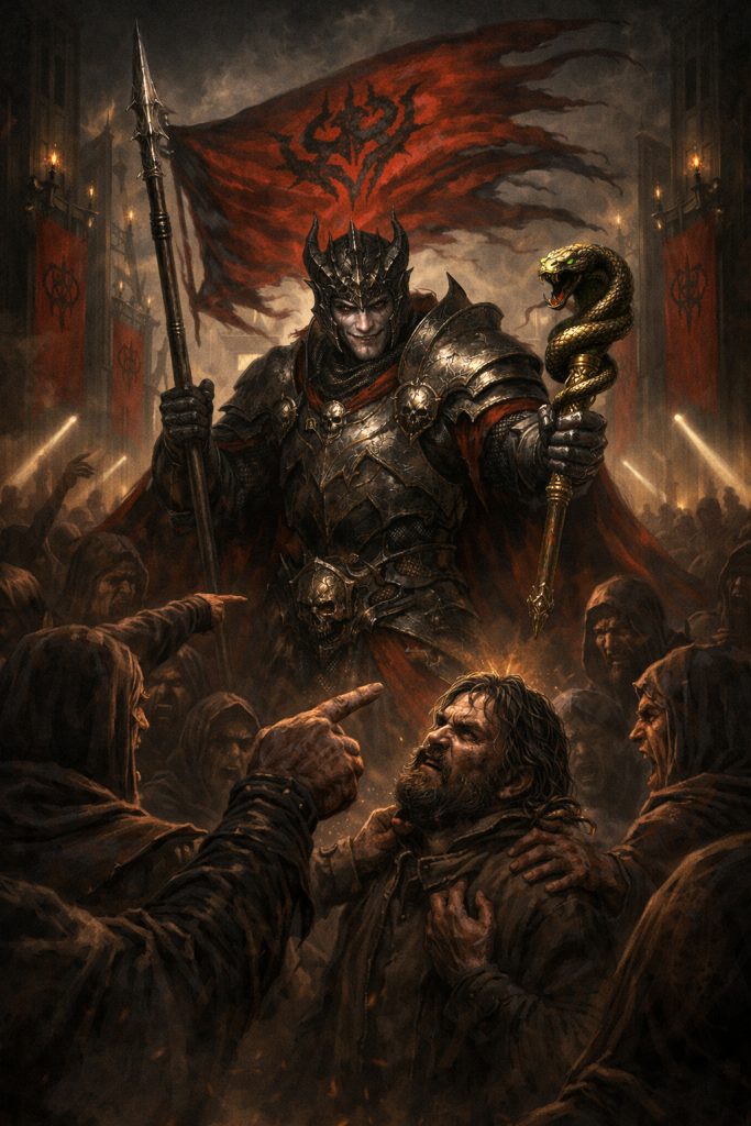 Знамя в руках рыцаря — это символ чужого имени, вынесенного наружу. Для одержимого Абигором это означает, что собственное имя стало слишком слабым, чтобы на него опереться. Поэтому он и воздвигает чужое, и несет его как ответ на внутреннюю пустоту. Так развивается специфическая психология “знаменосца”: человек ощущает себя представительством власти в быту, ее голосом в компании, ее правотой в разговоре, ее карающей рукой в сети или в институтах подавления, ее «сознательностью» на работе. Он начинает жить так, словно каждое столкновение с иным мнением — это атака на знамя, которое он обязан защитить. И поскольку речь идет о символе, любой спор перестает быть лишь дискуссией о фактах и превращается в сражение за честь.