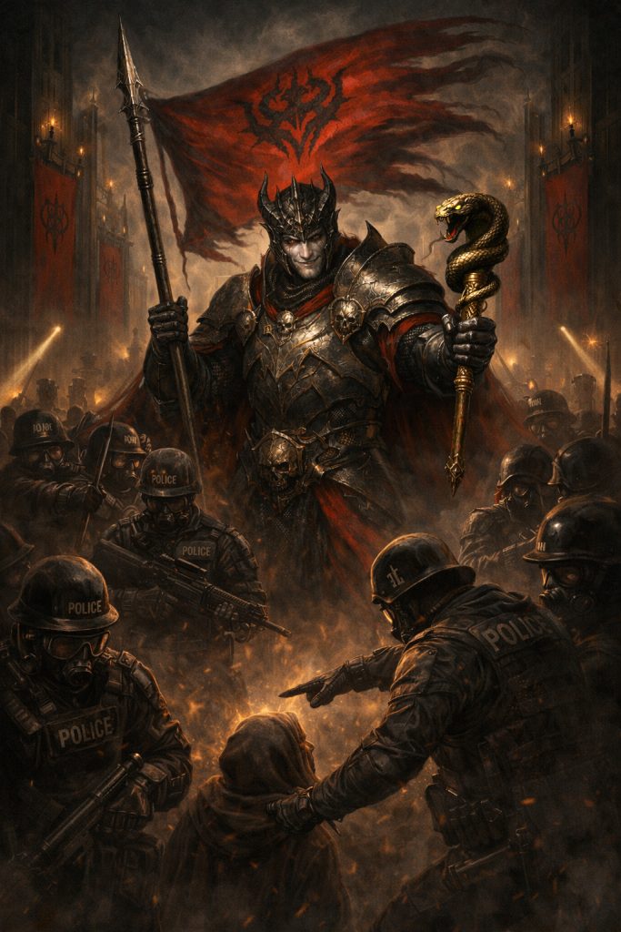 Копье в руке Герцога поддерживает и усиливает этот эффект. Оно превращает готовность к нападению в милитарное выражение верности. Знаменосец стремится видеть врагов повсюду вокруг, поскольку без врага поднятое знамя теряет свой сакральный смысл. Ему настоятельно требуется чужой, чтобы ощущать себя — своим. Ему требуется опасность, чтобы оправдать собственную истеричную жесткость. Ему требуется борьба, чтобы заглушить собственную тоску. В таком состоянии агрессия воспринимается как моральная задача, а унижение другого — как подтверждение собственной принадлежности к силе. Система получает бесплатного солдата, а Абигор получает пищу: энерии служения, возбуждение правоты, подавленную вину и сладость дозволенной и оправданной жестокости.