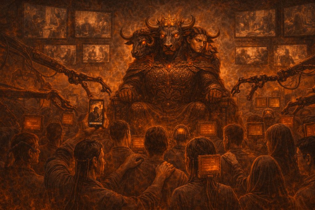 Однако это не означает, что Короли просто отступили; думать так – значит сильно недооценивать их. Несмотря на то, что огонь сексуальности, на котором так долго восседал Асмодей, сейчас все больше становится похожим на жалкую копоть, власть Короля обладания нисколько не уменьшилась; сменился лишь его доминирующий лик. Теперь Асмодей чаще проявляется не как Овен похоти, а как Телец информированности, и в современном мире алчность становится гиперпотреблением внешних потоков стимулов. Овен же в этом мире становится не олицетворением животной тяги, а образом рынка, контента, механического возбуждения без разрядки, без реальной встречи. В этих условиях в отношениях увеличивается не свобода, а пустота: тело реагирует, сердце молчит, воля истощается. Асмодей ни в коей мере не вытесняется Архонтной экономикой, он прекрасно адаптируется к ней и заставляет ее служить Царству Авариции. Когда внутреннего жара мало, его пытаются компенсировать внешним потоком активности, в данном случае – бесконечным потоком контента. При этом и ездовой дракон Асмодея перестал быть зверем инстинктов и страстей и стал механизмом новой среды: интерфейсы, ленты, уведомления, кликбейты, бесконечная доступность так же стихийны, как и горнило эмоций. Поэтому в современном мире Асмодей правит не тогда, когда человек “сорвался”, а когда он перестал вообще различать срывы, свой собственный и навязанный выбор. И если раньше главным инструментом Асмодея был тестостерон, то теперь это – дофамин. Современному человеку уже трудно верить в любовь, проще верить в стимулы, в технику, в суррогаты, которые не требуют риска живой встречи.