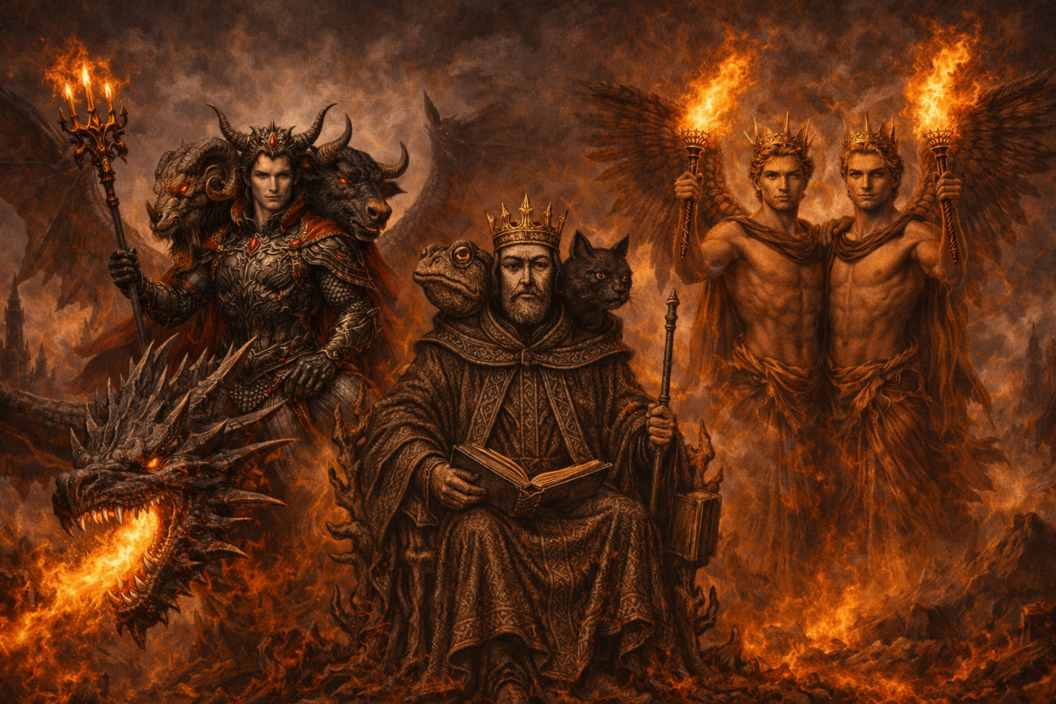 Мы уже как-то отмечали, что, к примеру, три верховных Короля греха – Баэль, Белиаль и Асмодей – являются в трехликих образах, что следует трактовать как их активность во всех трех стихиях психокосмса – разуме, чувстве и воле. Однако сам характер этих проявлений нередко остается недооцененным. Так, Баэль является с лицами человека (воля), кота (чувства) и жабы (разум), и при этом – имеет облик паука, парализующего движение. Белиаль проявляет два человеческих лика (два ангела), выражающих его власть как единство в противопоставлении, которые уравновешены драконом колесницы, выражающим гнев, на котором держится его власть. Асмодей показывается с лицами человека, быка и барана, и также восседает на драконе, который в данном случае означает сферу импульсивности как таковую, способность Асмодея манипулировать мощнейшими стихийными потоками чувственности/сознания. Также обращают внимание на гусиные лапы Асмодея (та же пороговость, «амфибность», что и в жабьем лике Баэля), иногда упоминаются и петушиные ноги как знак власти над чувственностью, а также моральную неоднозначность, и его змеиный хвост (знак обманчивой мудрости).
