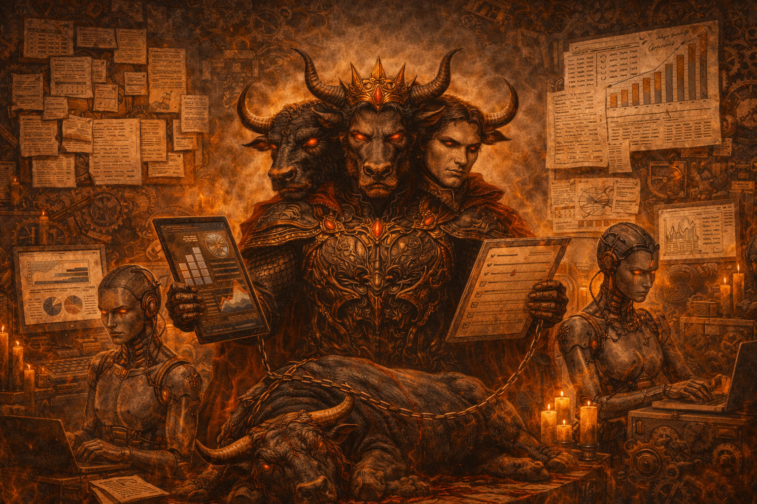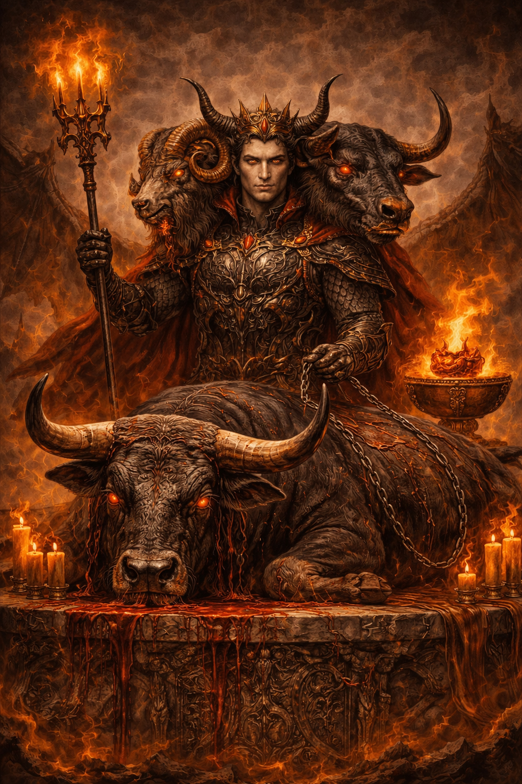 Однако это не означает, что Короли просто отступили; думать так – значит сильно недооценивать их. Несмотря на то, что огонь сексуальности, на котором так долго восседал Асмодей, сейчас все больше становится похожим на жалкую копоть, власть Короля обладания нисколько не уменьшилась; сменился лишь его доминирующий лик. Теперь Асмодей чаще проявляется не как Овен похоти, а как Телец информированности, и в современном мире алчность становится гиперпотреблением внешних потоков стимулов. Овен же в этом мире становится не олицетворением животной тяги, а образом рынка, контента, механического возбуждения без разрядки, без реальной встречи. В этих условиях в отношениях увеличивается не свобода, а пустота: тело реагирует, сердце молчит, воля истощается. Асмодей ни в коей мере не вытесняется Архонтной экономикой, он прекрасно адаптируется к ней и заставляет ее служить Царству Авариции. Когда внутреннего жара мало, его пытаются компенсировать внешним потоком активности, в данном случае – бесконечным потоком контента. При этом и ездовой дракон Асмодея перестал быть зверем инстинктов и страстей и стал механизмом новой среды: интерфейсы, ленты, уведомления, кликбейты, бесконечная доступность так же стихийны, как и горнило эмоций. Поэтому в современном мире Асмодей правит не тогда, когда человек “сорвался”, а когда он перестал вообще различать срывы, свой собственный и навязанный выбор. И если раньше главным инструментом Асмодея был тестостерон, то теперь это – дофамин. Современному человеку уже трудно верить в любовь, проще верить в стимулы, в технику, в суррогаты, которые не требуют риска живой встречи.