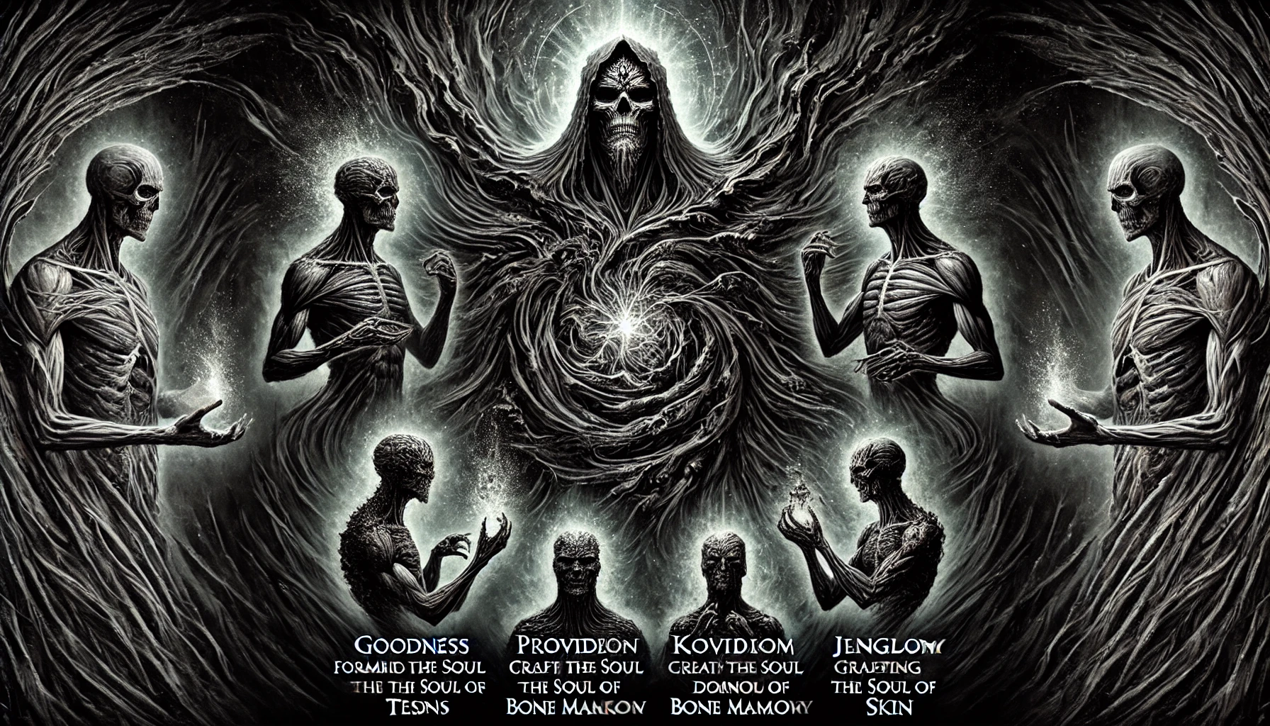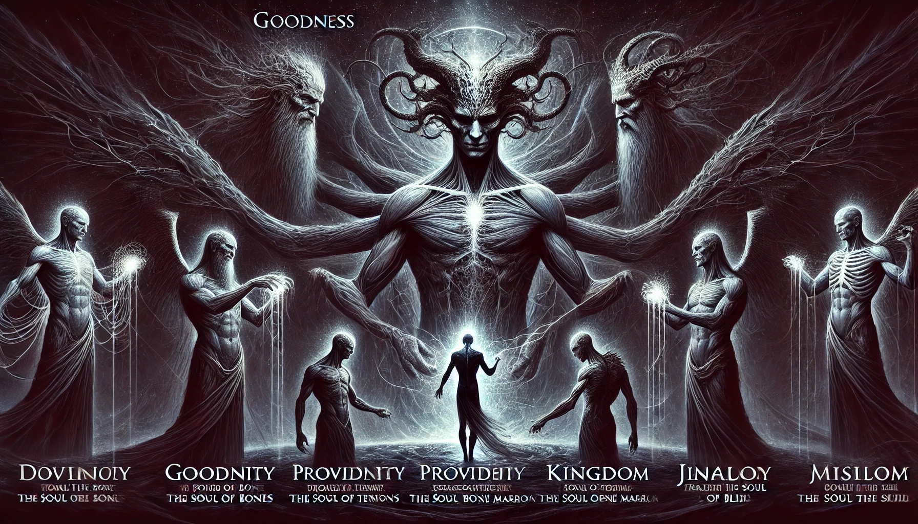 «И силы начали: первая, благо, создала душу кости, вторая же, провидение, создала душу сухожилий (нервов?), третья, божественность, создала душу плоти, четвертая же, господство, создала душу костного мозга, пятая же, царствие, создала душу крови, шестая, ревность, создала душу кожи, седьмая, мудрость, создала душу (глазного) века. И множество ангелов подступило к нему (Иалдабаофу), и они получили от властей семь сущностей душевных, дабы создать согласие членов и согласие органов и упорядоченную связь каждого из членов.» (Апокриф Иоанна).