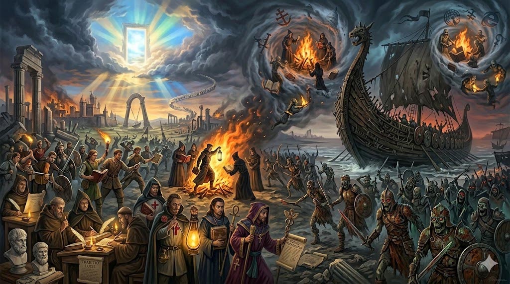 Поэтому каждый «темный» период макроистории — это своего рода разворачивающееся сражение на поле Вигрид. В каждой такой битве «живые», то есть здоровые, критичные и сострадательные, люди выступают в роли эйнхериев, противостоящих высадившемуся с Нагльфара воинству мертвецов и обезумевшим коллективным вихрям. Исторически такими эйнхериями оказывались все те, кто поддерживал суверенитет духа в эпохи распада: от ирландских монахов, переписывавших античное наследие в своих скрипториях, скрытых за стенами монастырей, до розенкрейцеров и герметистов, проносивших свет Традиции сквозь костры Инквизиции.