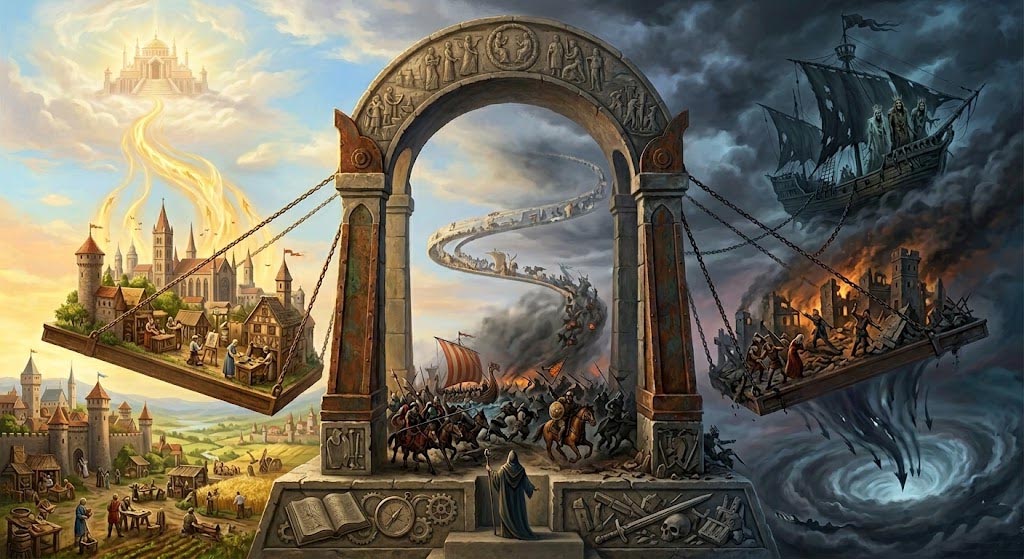 Поэтому историю и можно рассматривать как своеобразные «качели», в которых «победа» попеременно достается то живым (и тогда продукция энергии преобладает над оттоком в межмирье), то мертвым (и тогда происходят массовые оттоки). Фактически, это можно сравнить с историей Средневековья, когда народы, города и селения, жили под постоянным страхом набегов различных грабителей – викингов, кочевников, орд и подобных разорителей социального космоса. И в этом смысле периодические «вторжения рефаим» можно сравнить с набегами Нагльфара – корабля, который по скандинавским преданиям перевозит голодных мертвецов из Хель – в миры живых.