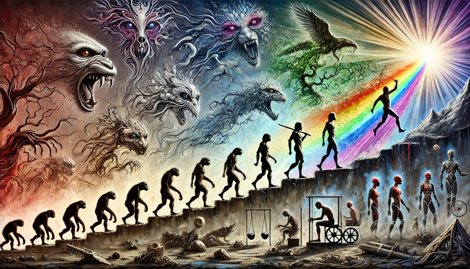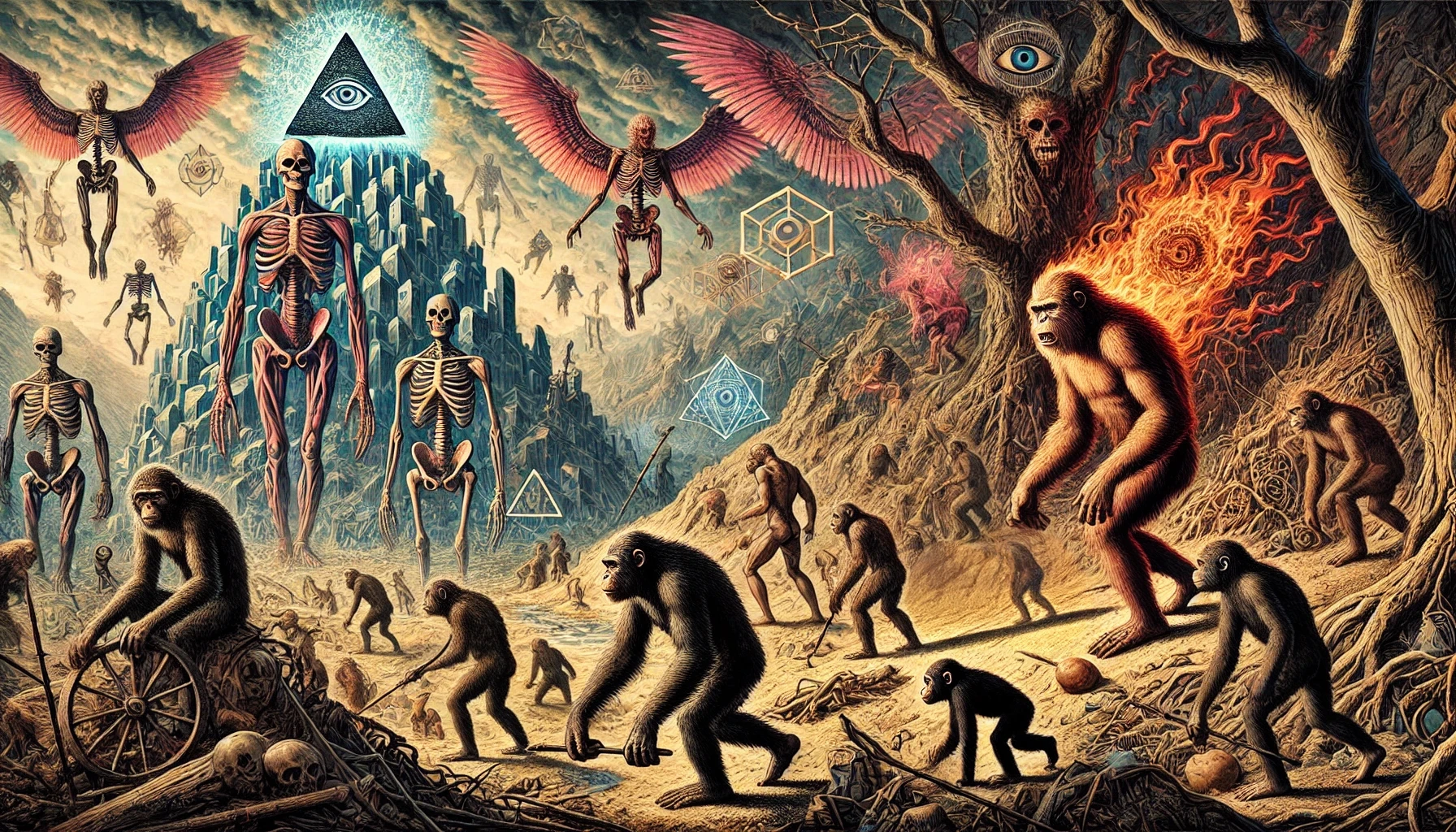 Было бы наивно считать что обезьяна — это единственный базис для развития человека (нейросеть). Например, имеются мифы о драконах мудрости, из яйца. Также говорят и о деревьях (т.н. вещие рощи — речь о микоризе, конечно). Сейчас полным ходом идет вторичное «сотворение» исскуственного интеллекта. А какие, с Вашей т.зр. тройки сил могли бы участвовать в их формировании?