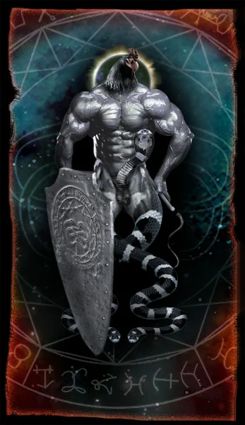 According to tradition, Abraxas is a warrior, who conquers evil in all its forms, a fierce fighter for justice, understood as creative order, conformity to the cosmic plan. He, like the rooster, which is the symbol of the rising sun, is the first to greet each new morning of each new day.