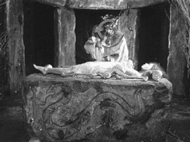 On one of the plates from the cult cauldron found near the site of Gundestrup in Denmark, a giant figure is depicted lowering a small human headfirst into a cauldron. For a long time this image was interpreted as human sacrifice by drowning. A comparison of this scene with the text of one of the Welsh epic traditions allows the suggestion that the plate shows a miraculous cauldron of life into which fallen warriors were placed so that on the following day they would be resurrected and take part in battle again.