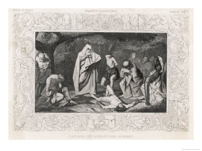 Knowledge of the druids, their place in Celtic society, and their principal functions comes primarily from ancient sources, among which the sixth book of Julius Caesar’s Commentaries on the Gallic War is rightly considered the most interesting and complete. It contains the following description: “The druids take an active part in the worship of the gods, they oversee proper performance of public sacrifices, and they interpret all questions relating to religion; many young men come to them for instruction in the arts, and generally they enjoy great prestige among the Gauls. It is they who pronounce almost all decisions in disputed matters, public and private; whether a crime or murder has been committed, whether there is a dispute over inheritance or boundaries — these same druids decide; they also assign rewards and punishments; and if anyone — whether a private individual or a whole nation — does not submit to their decision, they exclude the guilty from sacrifices. This is their severest punishment. One thus excluded is deemed impious and outlawed, everyone shuns him for fear of misfortune, as though from contagion; however much he may plead, he is denied legal recourse; he has no claim to any office. At the head of all the druids stands one who holds the greatest authority. Upon his death the most worthy succeeds him, and if there are several such, the druids decide by vote, and sometimes a dispute over precedence is even settled by arms. At a certain time of year the druids assemble at a consecrated place in the territory of the Carnutes, which is regarded as the center of all Gaul. Here all those engaged in litigation converge from everywhere and submit to their decisions and judgments. Their learning, it is thought, originated in Britain and was brought from there into Gaul; and even now, in order to study it more thoroughly, they go there to study. The druids generally do not take part in war and do not pay taxes like other people; they are free from military service and from all other duties. Owing to these privileges many enter their schools partly of their own accord and partly sent by parents and relatives. There, it is said, they learn many verses by heart, and thus some remain in the druidic school for twenty years. They consider writing verses down sinful, whereas in almost all other cases, in public and private records, they used the Greek alphabet. It seems to me that this practice is established for two reasons: the druids do not wish their doctrine to be made public and they think that, were their students to rely too much on writing, they would take less trouble to strengthen their memory… Above all, the druids teach the belief in the immortality of the soul: according to their teaching, the soul passes after death from one body into another; they believe that this faith removes the fear of death and thereby inspires courage. Besides, they teach their young pupils about the heavenly bodies and their movements, about the size of the world and of the earth, about nature and about the power and authority of the immortal gods“.