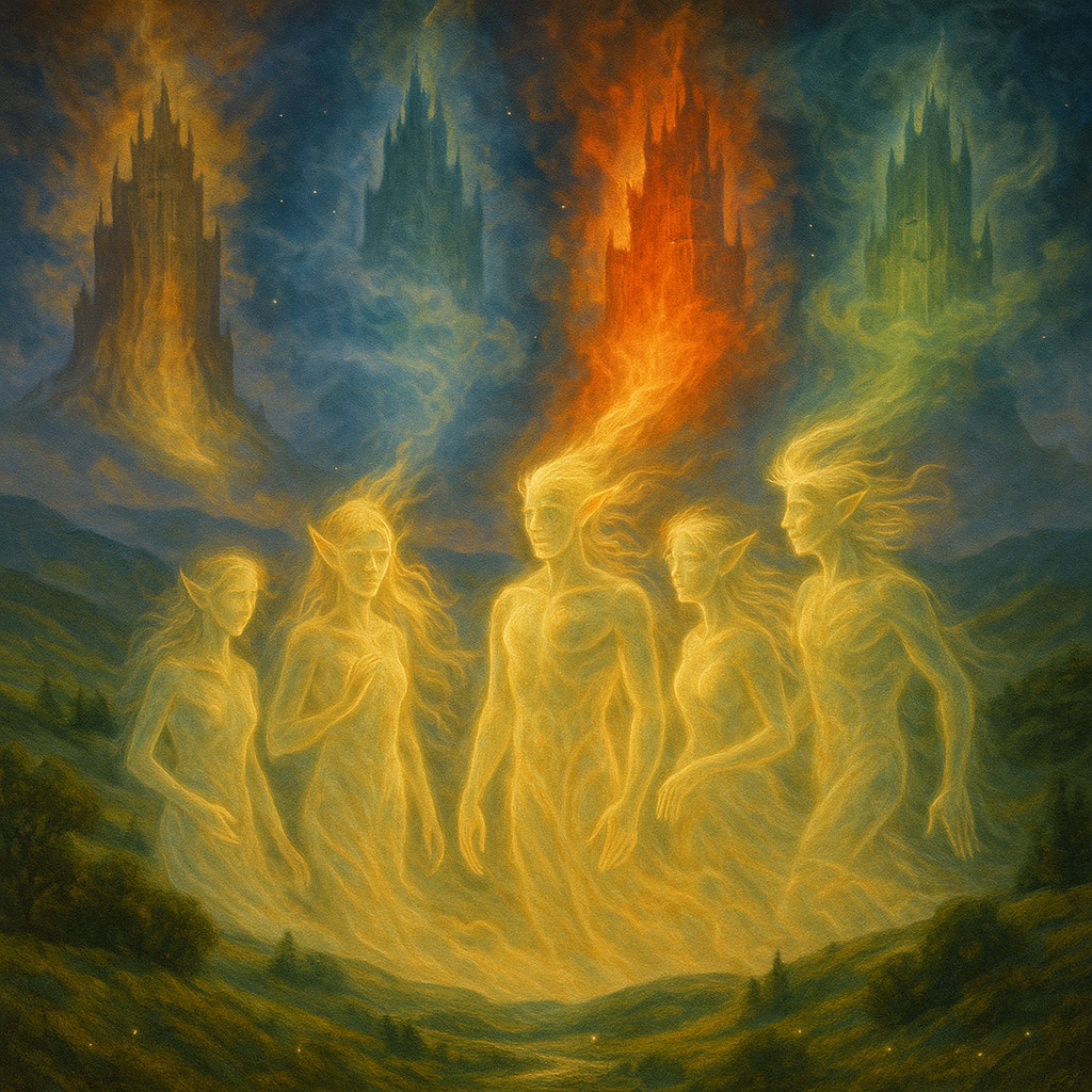 Each City is an element gathered into a polis: the inertia of Earth, the fluidity of Water, the vertical movement of fire, and the horizontal movement of air — each populated by its own elementals. Thus Falias holds form and truth (earth, gnomes), Murias dissolves knots and sees depths (water, undines), Finnias inspires and purifies (fire, salamanders), Gorias lightens and lifts mind (air, sylphs). In the terms of the Interworld, these are spaces built from pure properties, and that is precisely why it is easier within them to align the Castles of the alves (and the sidhe) with the “distilled” flows of reality, to build them as pure and harmonious structures.