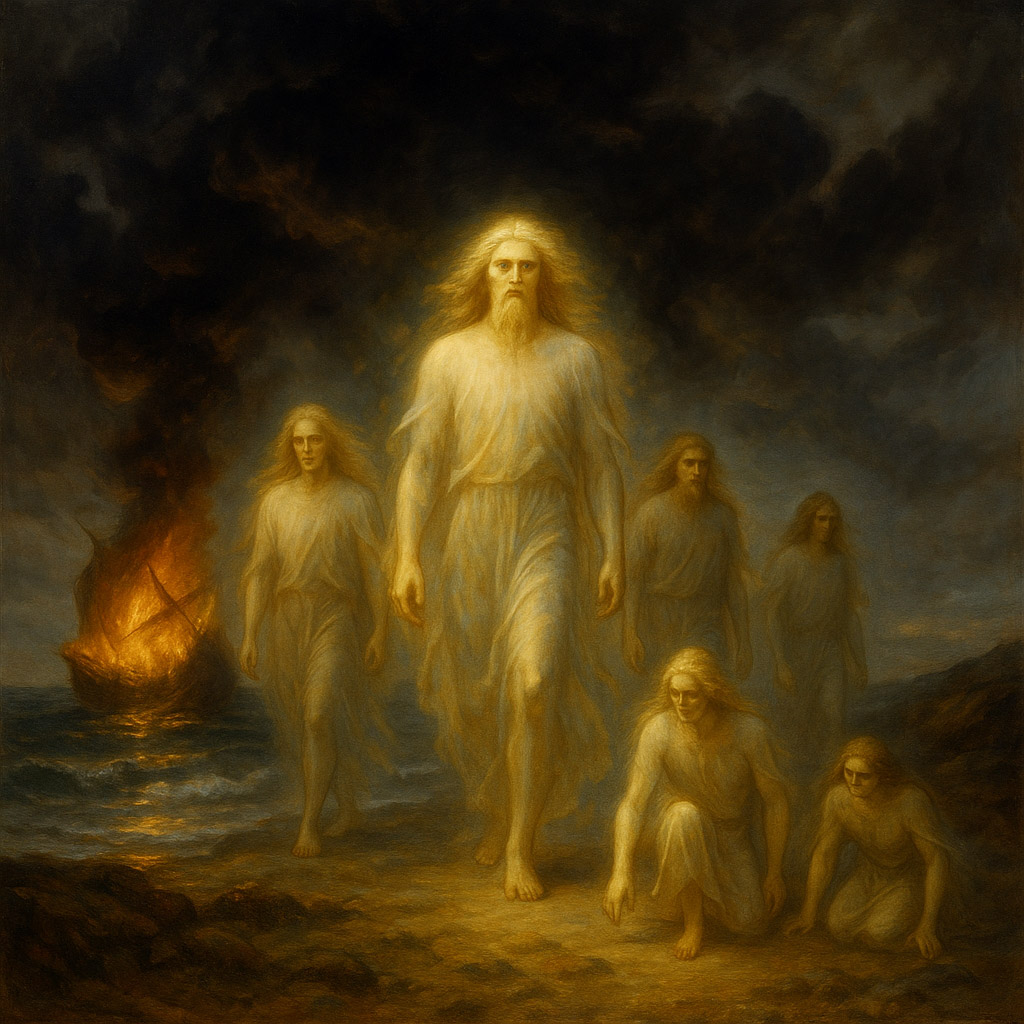 When the time came, the Tuatha “arrived in dark clouds” on Earth (in Connacht); later versions explain this image by saying that they burned their ships so as not to return. The dark cloud is an image of passage through the Interworld, when form is not yet fixed; the burned ships are an act of anchoring in the world, a refusal of the path back.