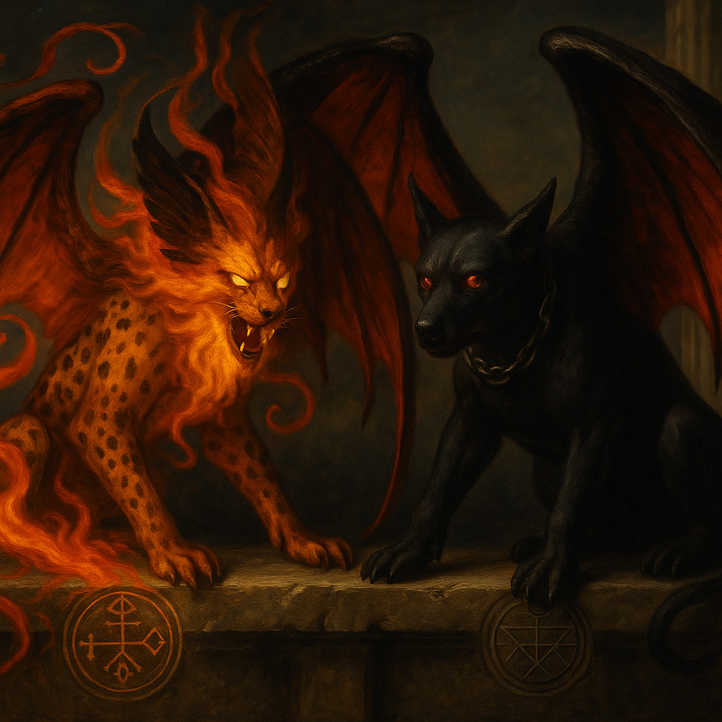 This is the fundamental difference from Flauros. The leopard is a “demon of repulsion for its own sake,” whose fury is an outburst of distorted vitality: forest fires, desert heat, reactor plasma — the state of mind “overflowing its banks,” prone to affective outbursts and burning out the victim; he is truthful “in the triangle,” but outside the ritual space he deceives, and therefore must be “brought into the triangle” or he will destroy the summoner himself.