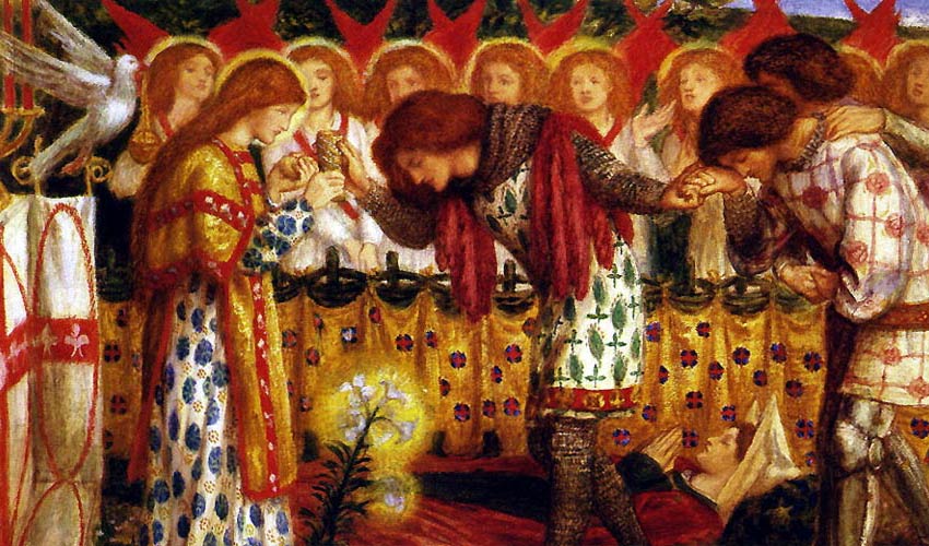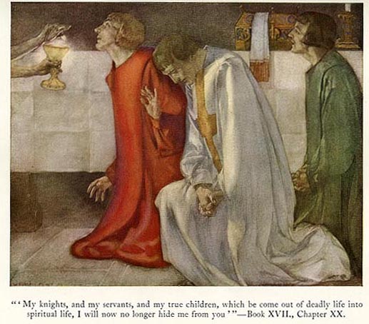 The king of Sarras, a pagan, learning of this miracle and that they had brought the throne with the sacred cup into the city temple, had them thrown into prison. But a year later he fell ill and sent for the knights and began to beg their forgiveness. Galahad, Bors, and Percival forgave him, and after the king’s death the townspeople chose Sir Galahad as their king. Galahad reigned as king of Sarras for exactly one year, and each day the knights of the Round Table offered prayers, and then on one Sunday, at his request, the Lord called Galahad to Himself and sent for Joseph of Arimathea,” from whose hands the knight received the holy sacrament, and soon, still quite young, he died. Having looked deeper into the mystery of the Grail, Galahad no longer wished to live and died in the midst of great beauty. At the moment of his death a hand reached down from heaven and took the sacred cup away. From that time on no human being has been granted sight of the Holy Grail.