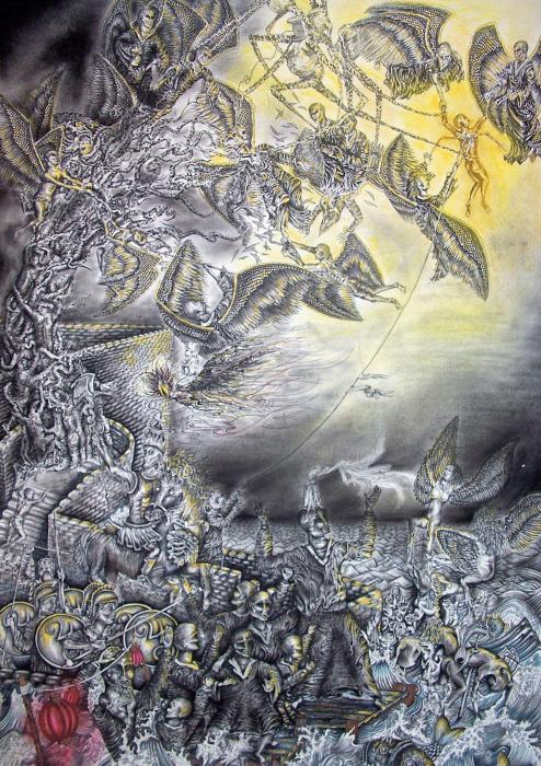Thus these shells are usually presented as destructive, selfish, and, to a certain degree, attractive elements of the world’s creation. They are the “dark side,” the shadow of destruction cast by the Creating Light. In Crowley’s words, “The Abyss is the void of being; it is felt through all possible forms, where each is equally empty, each therefore evil in the single sense of the word — because it exists. Every possible form is meaningless and thirsts to become real. These forms whirl insensibly in a random multitude like dust-laden demons, and each accidental joining of parts proclaims itself an individuality and screams ‘I am I!’, while knowing that its parts have no true connection. And the slightest agitation disperses the delusion, just as a horseman, meeting a dust-laden demon, drives it into the dusty storm to the ground.”