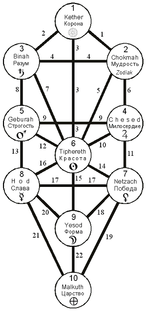 The paths by which Light passes from sefirah to sefirah are called tzinoroth (channels). For example, from Keter one can pass to Chokhmah via the channel Aleph (that is, the Active path, the way of “turning work into play”) or to Binah via the channel Beth (the way of sterile passivity). In other words, in our example the idea of writing the post can be realized by thinking it through first and only afterwards formatting it into written form (the Beth way), or the set of letters can proceed in parallel with the thinking of the meaning, with on-the-spot editing (the Aleph way). Obviously the Aleph way is faster but more prone to errors and inaccuracies; on the other hand, the Beth way is less prone to error, but that errorlessness can miss the right moment for realization.