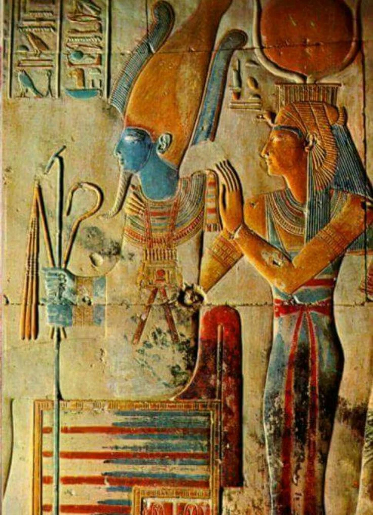 As Plutarch says, “Isis is the feminine principle of nature (physis), and she contains within herself every birth“; “Iset” means foundation — throne — upon which life abides; she is called “Mother” or “All-Benevolent.” Sometimes a king is depicted sitting on Isis’s lap, emphasizing that she is his support and throne.