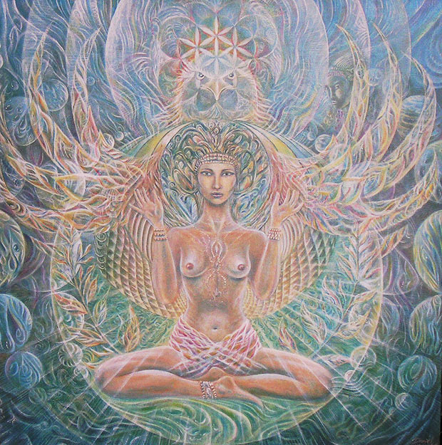“When the Great Spirit filled space with waves of His rays, piercing the darkness and creating myriads of worlds, She — Bright, Pure and Perfect — continued to reign as One in the cosmos. Not for a moment did She fall into deathlike repose; She mourned the destruction of the Whole — Her Divine Consort; She experienced every turn of each spirit’s life, every movement of the soul of every being. She remained Indivisible in Her Great Whole and, hovering in the boundless expanses of the universe, She carefully gathers the remnants of Her Consort and weaves from His shards a majestic Form.”