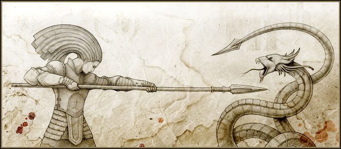 From this, the symbolism of the hero-warrior fighting with this serpent is clear. Look at the picture in the article, where the warrior on the left is battling his self-reflection on the right with the help of a straight unyielding spear of intention, honed by discipline and control.
