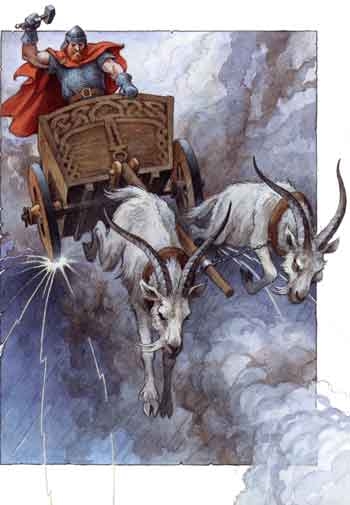 Perun’s chariot is drawn by winged stallions, white and raven-black. Thor’s chariot is drawn by goats (gnashing). Both horses and goats likewise express the dual power of the Sky-God — on one hand force, on the other fertility.