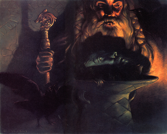 The second point is decapitation, or more precisely, the “disembodiment” by the Vanir of Mímir, handed over to them as a hostage by the Aesir. Mímir, Lord of the Well of Wisdom, deprived of his body, becomes a speaking head, a pure embodiment of wisdom that gives counsel to Odin in difficult hours. This event corresponds to the division of nature symbolized by the Aesir and the Vanir. Just as the Aesir, by slaying the primal being Ymir, created the world, so the Vanir, by dividing Mímir — keeping his body and sending the head to the Aesir — partitioned Wisdom into “Wisdom of the Body” and “Wisdom of the Mind.”