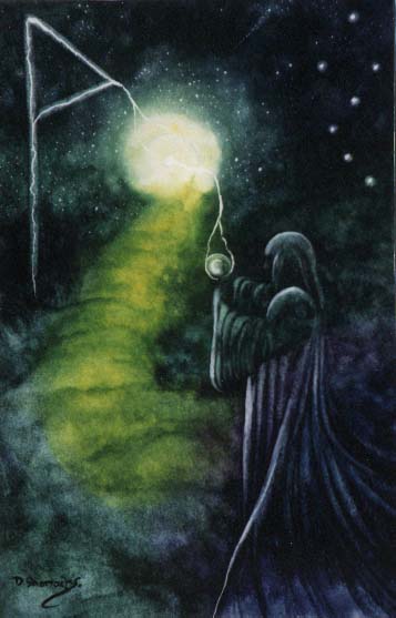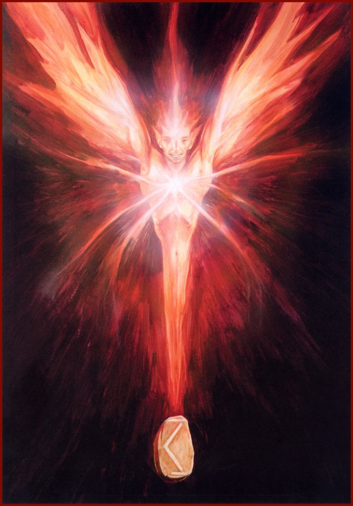 Overcoming the fatigue of Raidho leads to the clouds that had shrouded the mind at that stage beginning to disperse, and a ray of hope breaks through them. The Kenaz stage is characterized by the traveler’s calm conviction of his Way’s importance. This awareness gives birth to a new confidence, unlike either the enthusiasm of Fehu or the routine of Raidho — a confidence in a bright finale. This confidence, in turn, rekindles the desire to move, almost forgotten in the Raidho stage. Usually, at Kenaz some favorable opportunity for advancement appears — a new, energizing acquaintance, a timely book, or a fortuitously visited Place of Power. Kenaz is accompanied by the final destruction of the old world, remnants of which still hung as ballast in the Raidho stage, and this destruction is often rather traumatic, because the Way traveled by that time allows one to soberly appraise one’s past life, past motives, and to be distressed by their unworthiness. The danger of the Kenaz stage lies precisely in self-abasement, which may develop as a result of discovering the rottenness of one’s past life, and, consequently, in dejection and a feeling of one’s “unworthiness” of the Way. Overcoming this obstacle is achieved through accepting responsibility, realizing that the past is a burden that must be carried; nevertheless, the only way is to keep moving with this load.
