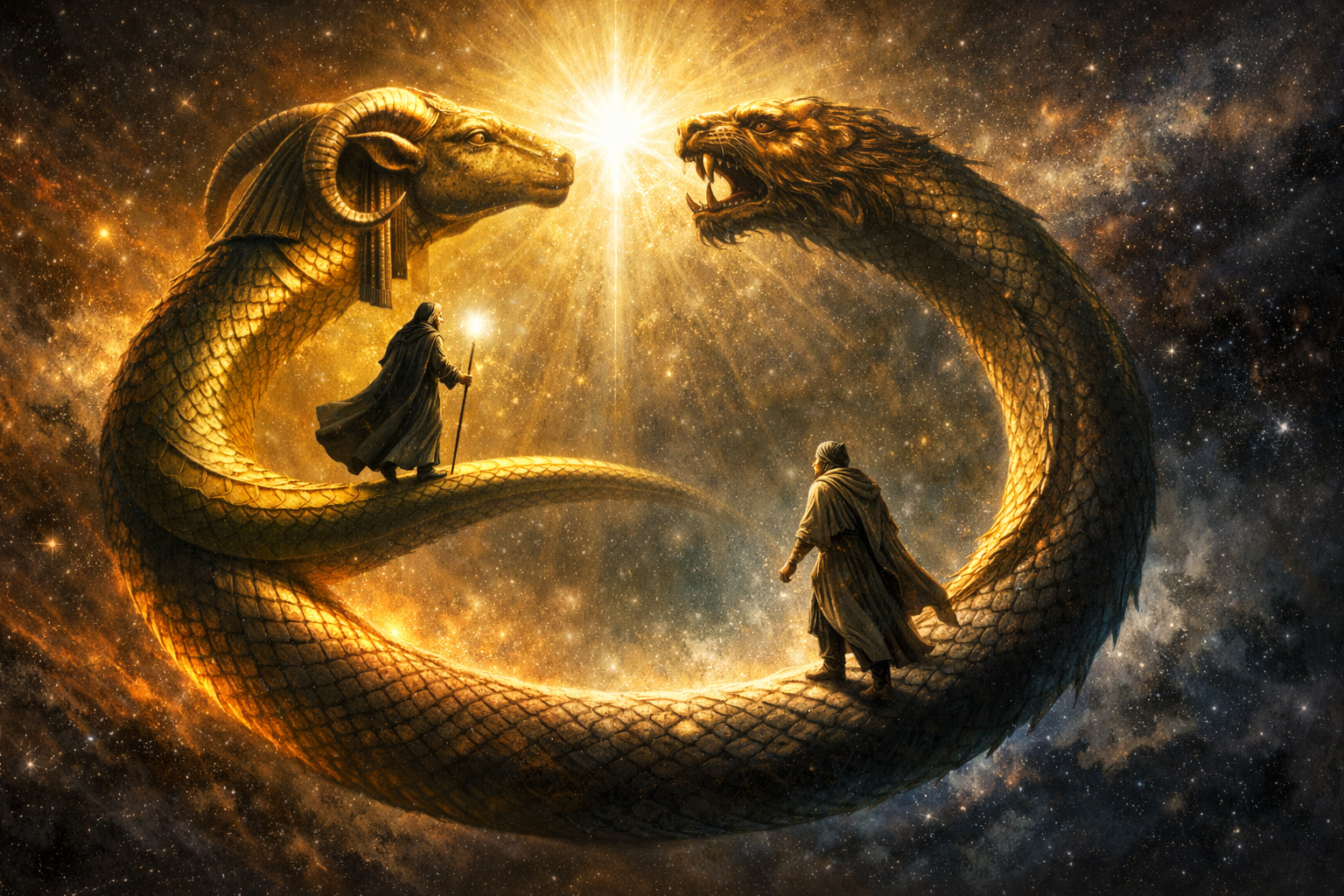 При этом, несмотря на разные акценты, два рассматриваемых Пути фактически представляют собой движение по Уроборосу в разных направлениях, где голова (чистый дух, Нус) и хвост (плотная материя, Демиург) являются частями единого живого тела. Герметический путь — это восхождение от «хвоста» (плотной материи) к «голове» (чистому Нусу), где сознание последовательно одухотворяет формы. Гностический же путь манифестирует стремление «головы» освободиться от «хвоста», совершив вертикальный прорыв к источнику. Когда путь «исправления» (герметизм) пройден до конца, материя становится настолько прозрачной, что перестает быть материей и становится чистым Светом. Когда путь «воспоминания» (гностицизм) пройден до конца, то Дух осознает, что даже тьма Иалдабаофа была лишь глубокой тенью его собственного сияния. В конечном итоге обе «души» Осириса смыкаются в кольце: как только Мудрец пробуждает в себе Нус, его внутренний Иалдабаоф неизбежно трансформируется обратно в Хнума, восстанавливая утраченную прозрачность мира.