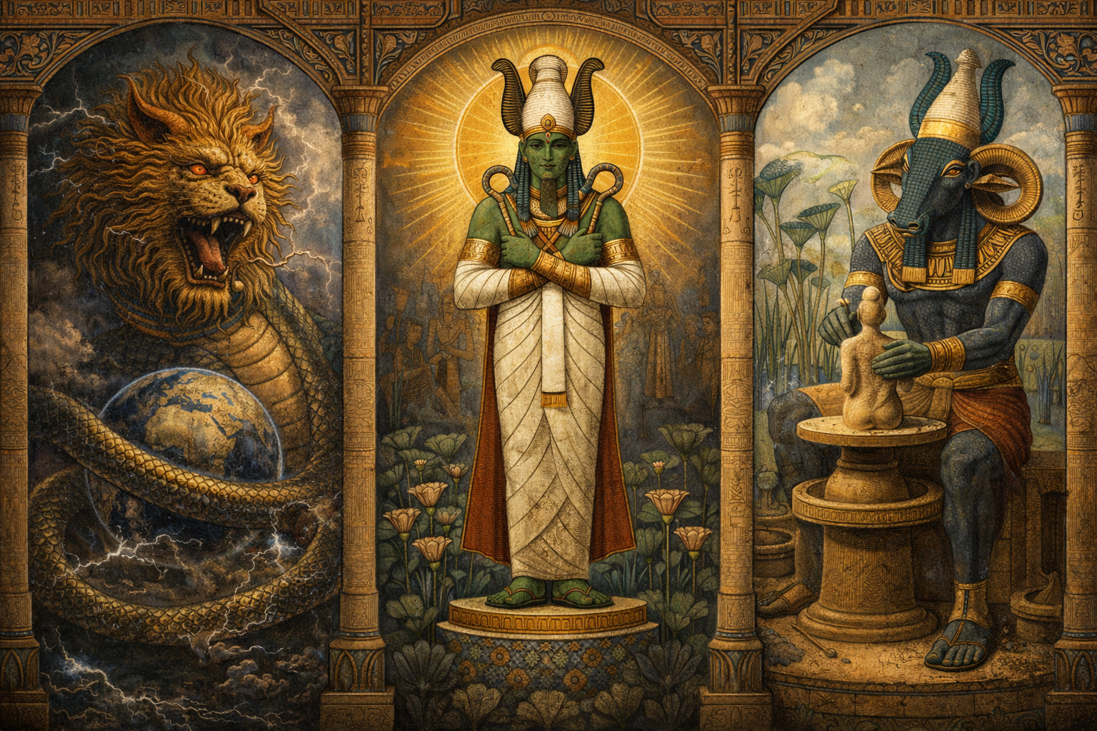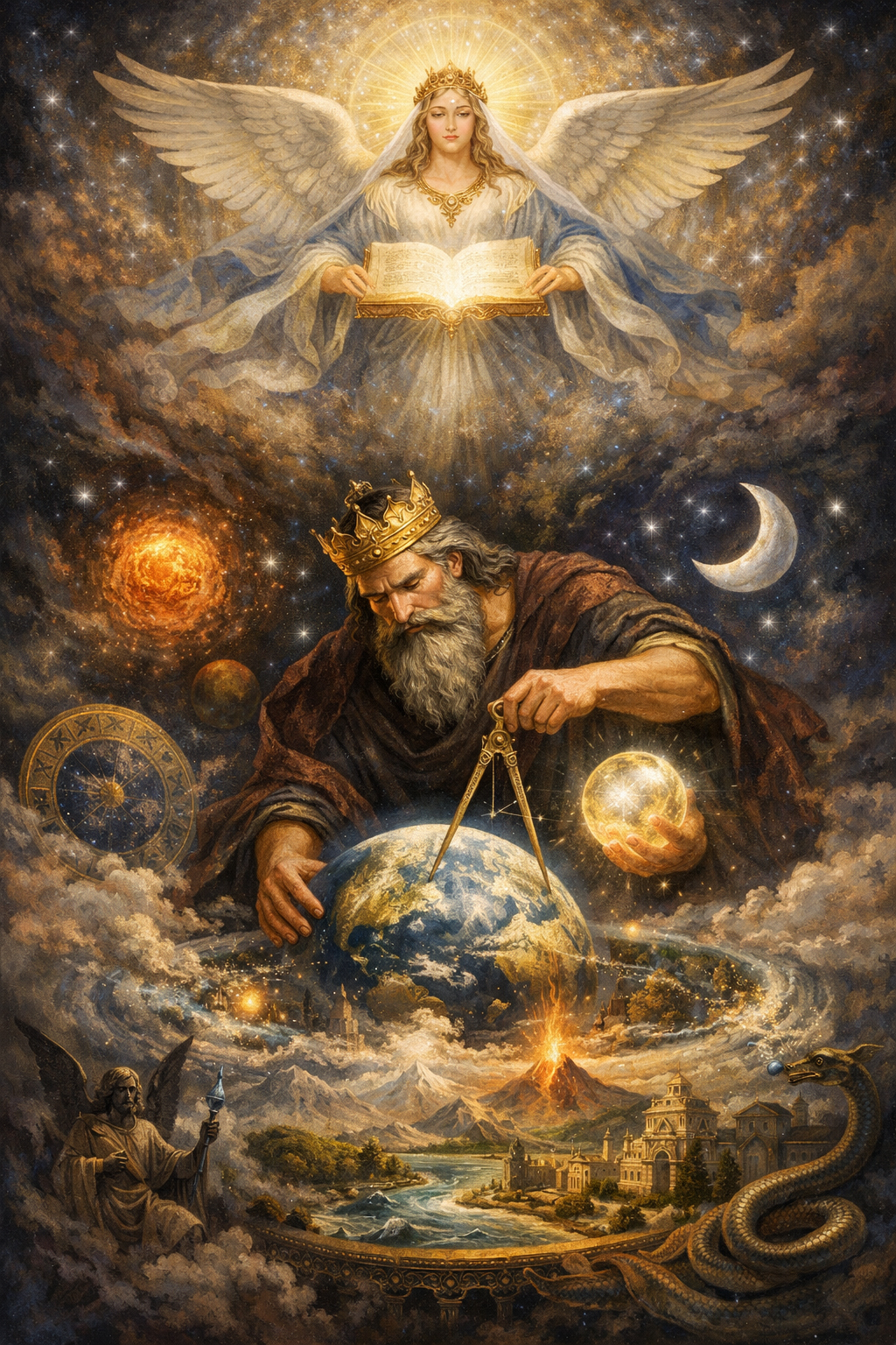 В традиционных системах (Египет, Индия, Греция) Демиург — это необходимый мост между абсолютным Единством и множественностью материи: Хнум, Бог-гончар, который проявляет индивидуальную заботу, вылепливая тело и жизненную сущность (ка) каждого человека на своем круге, Вишвакарман, Божественный архитектор, обладающий Вишва-чакшус, «всевидящим оком», и строящий мир как сцену для освобождения души, Гефест, Мастер, который через творческий труд оправдывает материю, создавая объекты запредельной красоты даже в несовершенном мире. За этими мастерами всегда стоит высший Разум и «Мысль» (Птах и Сешат — для Хнума, Зевс и Афина — для Гефеста, Брахма и Вач — для Вишвакармана). В этих системах Демиург — послушный исполнитель божественного замысла. Он осознает временный характер создаваемых им «декораций» и строит их для создания пространства, в котором душа может пройти свою драму освобождения. При этом, к примеру, хромота Гефеста может быть трактована как ключевой символ травмы эонического разума, Нуса, при контакте с материей, как вечная попытка компенсировать несовершенство плотных миров созданием идеальных интеллектуальных механизмов.