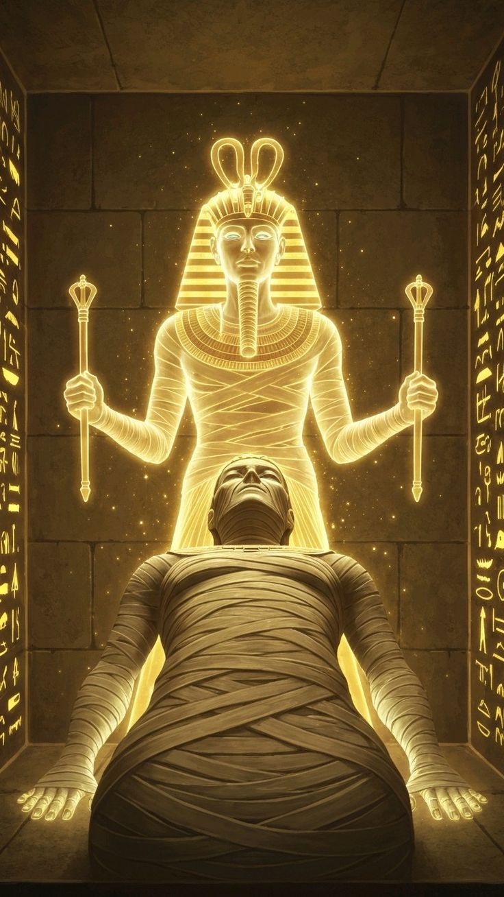 В первой фазе, когда Осирис «мертв» или расчленен Сетом, его творческая энергия — его ба — оказывается лишена руководства пробужденного Интеллекта. Это и порождает Иалдабаофа — Бога в состоянии предельной объективации, когда Он перестает проживать мир как Себя и начинает воспринимать его как внешнюю, механическую «вещь», что в египетской традиции соответствует образу Мехенти-эн-ирти, «Хозяина Слепоты» — ипостаси Гора, которая действует, пока Осирис мертв. Таким образом, Мехенти-эн-ирти, Иалдабаоф — это первая «душа» Осириса, действующая в условиях метафизической слепоты. Этот Демиург правит миром «на ощупь», превращая потенциальный храм в механический автомат гемармена, где законы природы выступают как жесткий алгоритм программы, забывшей своего создателя. Сопутствующие ему стражи-Архонты соответствуют египетским Семи Духам Месехтиу — холодным юридическим силам, которые воплощают судьбу в ее самом неумолимом виде, «вяжут» душу и требуют знания тайных имен для прохода сквозь врата Аменти. Гностики увидели в этом состоянии актуальную реальность «мира смерти» (Аменти), где дух полностью скован материей, подобно туго запеленатой мумии.