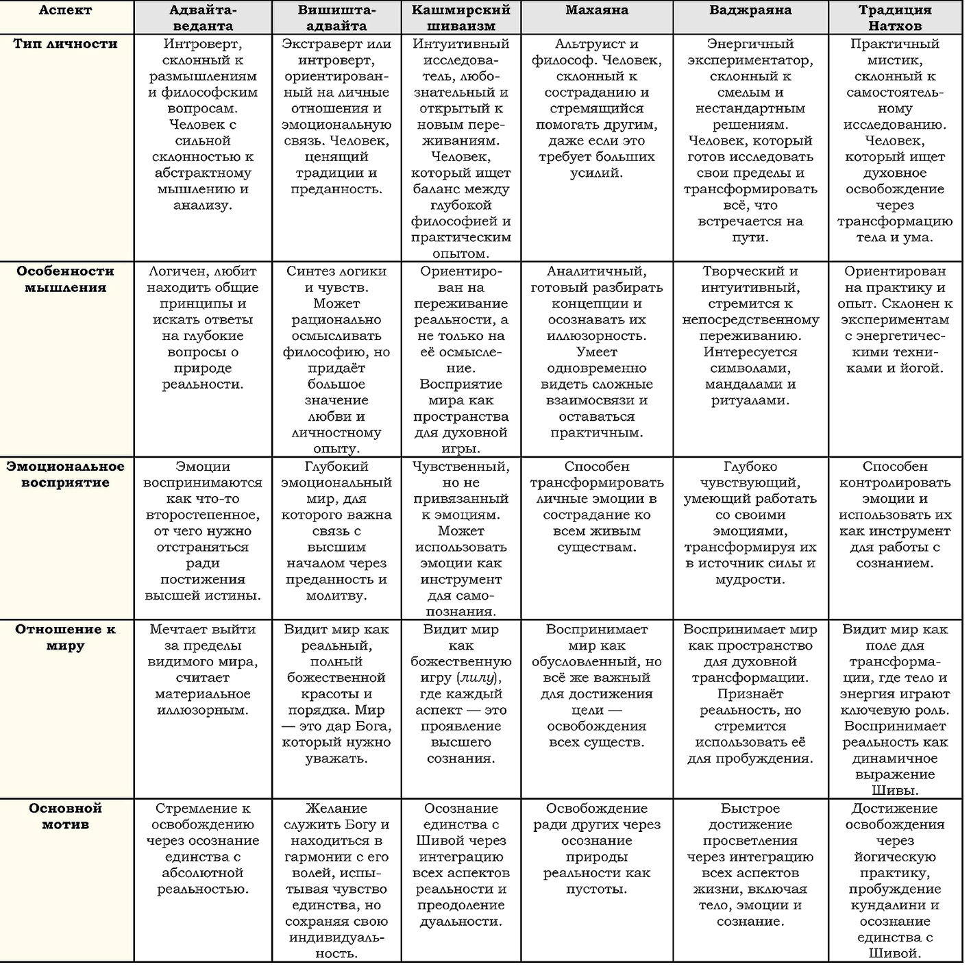 Таким образом, каждая из школ имеет как свои мировоззренческие, так и практические особенности, которые, в конечном итоге, и определяют, кому из Путником и искателей подойдет та или иная традиция. Попробуем еще раз суммировать некоторые важные аспекты.