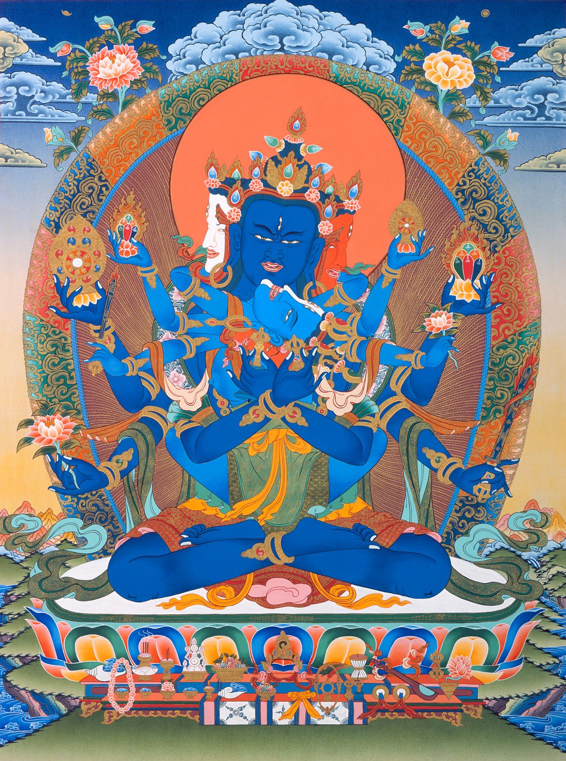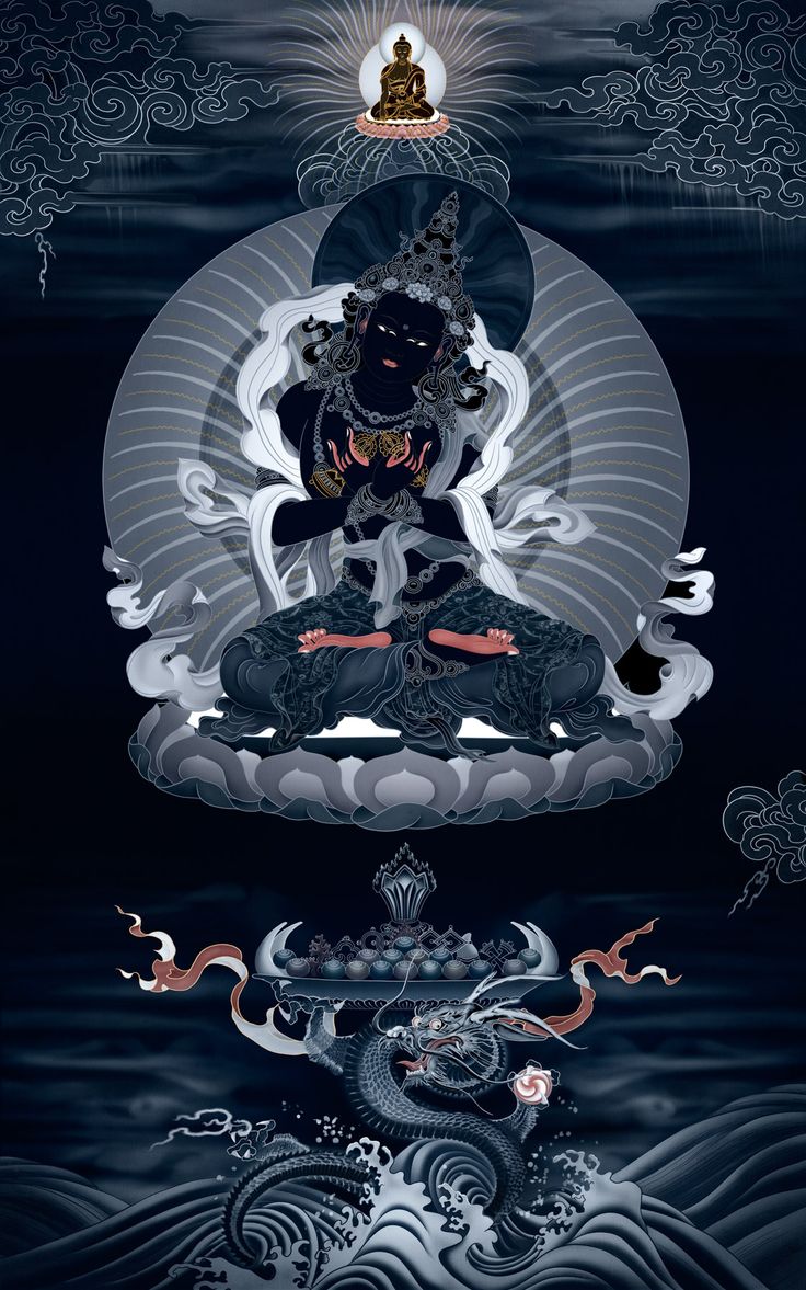 2. Ваджрадхара: Синий, ночной, иррациональный, выражает ночное, трансцендентное и скрытое. Это — аспект глубинного опыта, связанный с интеграцией подсознания и его трансформацией. Его синий цвет выражает бесконечность и глубину, выходящую за пределы видимого и рационального.