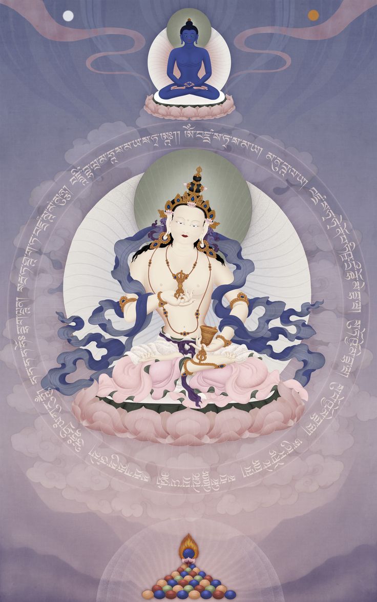 1. Ваджрасаттва: Белый, дневной, рациональный, олицетворяет абсолютную чистоту и очищение кармы, что соответствует «дневной» стороне сознания, связанной с ясностью, очищением и упорядочиванием. Его белый цвет ассоциируется со светом, ясностью и осознанностью, что также подчёркивает рациональный подход к духовному развитию через анализ и самоконтроль.