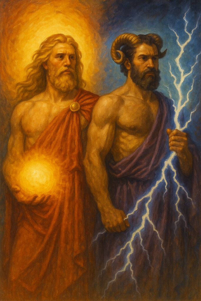 В более «мирном» смысле Первичный Огонь выражают такие фигуры, как Гиперион (др.-греч. Ὑπερίων — «Очень высокий») – Отец Солнца в классической мифологии или Крий (Криос, др.-греч. Κριός, Κρῖος или Κρεῖος — «Овен») – сила Первозданной Жизненной активности, его еще связывают с молниями и Небесным огнем, которые, однако, также выступают против богов и их космизирующей активности.