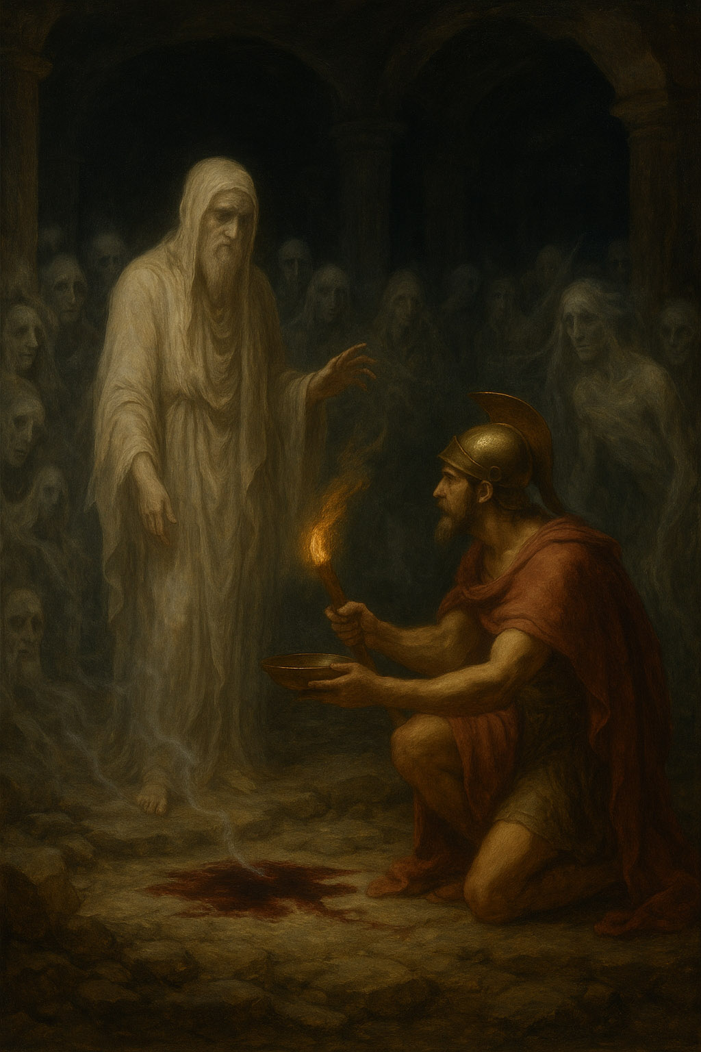 В гомеровских поэмах рассказывается, как Одиссей спускался в подземное святилище Аида и Персефоны — Некромантеион, чтобы вызвать тень прорицателя Тиресия и узнать путь домой. Описанное там пространство — это типичные Асфоделиевые луга, где тени блуждают, не зная, кто они, пока не получают напоминания с помощью энергии крови.