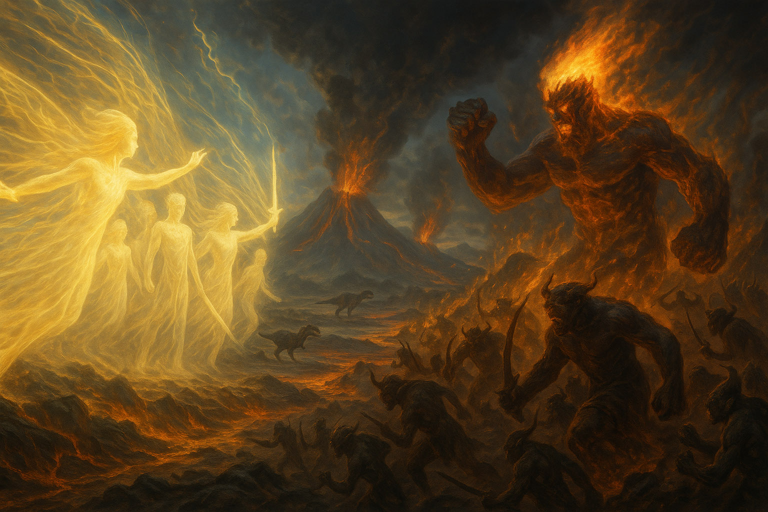 Это была решающая схватка Туата де Дананн с Фоморами за управление потоками вещества и энергии и направление эволюции материи, готовящейся принять новую волну сознания. Фоморы, вышедшие из Промежутка, куда их оттеснили в прошлые эпохи, и создававшие в мире гигантских существ, научились выжигать тела сидов демоническим огнём. Туата де Дананн, опираясь на поддержку альвов, ванов, асов и ремесленную помощь свартальвов (через их учеников — кобольдов, коблинов, форгов, лепреконов и других), собрали союз светлых сил и вернули эволюции созидательное направление. Когда чаша весов уже склонилась в их пользу, фоморы задействовали «Глаз Балора» — три удара «небесным огнём». В мифоисторическом параллелизме это — мелово-палеогеновая катастрофа, гибель древних экосистем и конец господства динозавров.