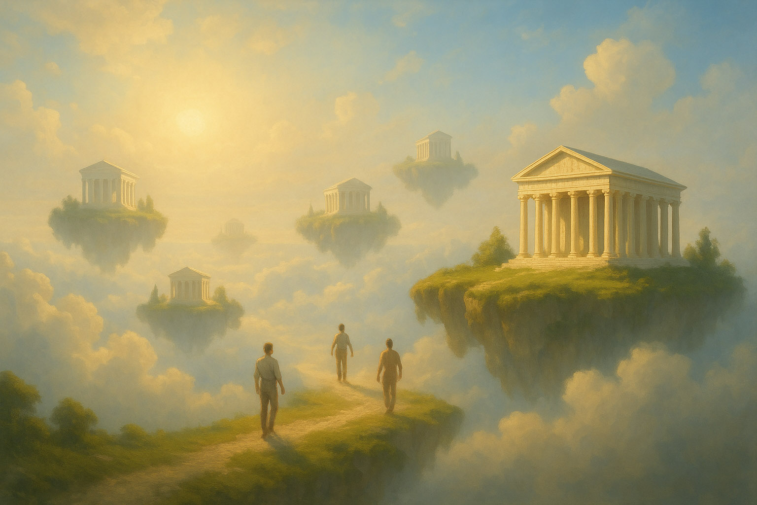 Светлые альвы смягчили этот изъян, выстроив на центральной сфере особые «Храмы» — светоносные структуры, возникающие, когда множество душ одновременно тянется к единству. В сиянии этих «Храмов» обитатели BAG могут ненадолго собираться: делиться опытом, звучать как единый хор, усиливать сопричастность Высшему, однако все равно затем возвращаться на свои острова, пусть и уже несколько более ясными и наполненными. Однако эти «собрания» всегда кратки: личная форма-опора влечет обратно, и BAG так и остается пространством «холодного» блаженства, а не любовного единения.