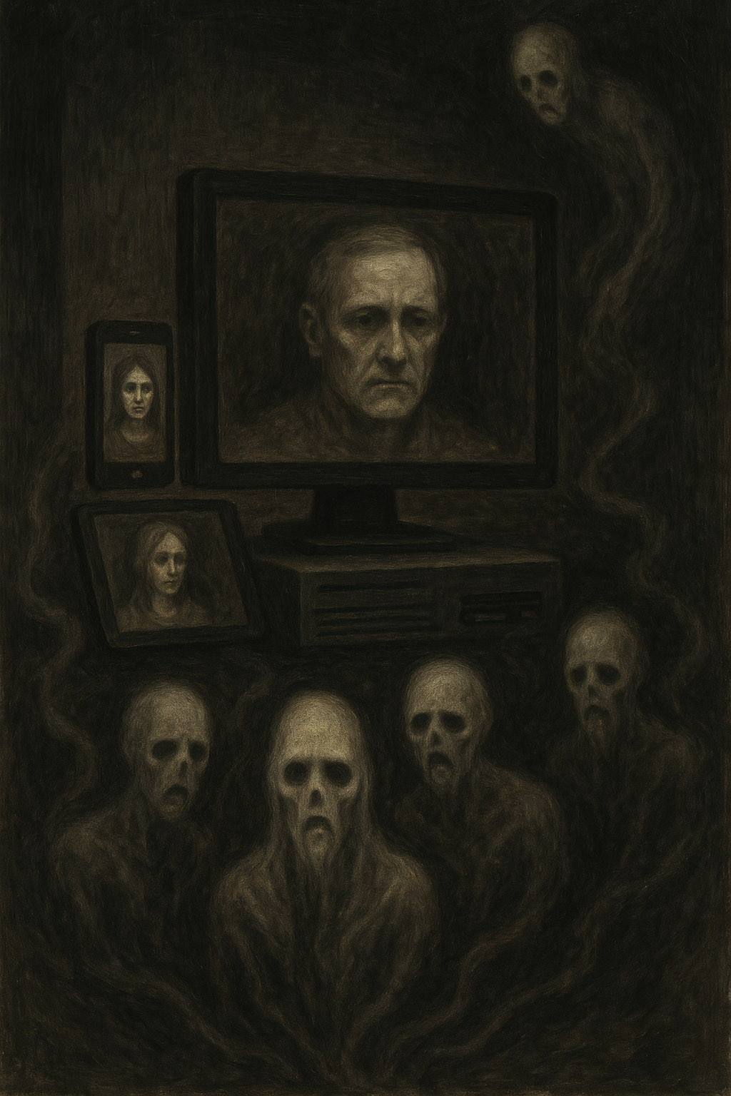 В отличие от традиционных форм взаимодействия с умершими, основанных на энергиях поминовения, очищения и отпускания, цифровое взаимодействие с мертвыми все чаще оказывается противоположным по своей сути: оно не завершает связи, но продлевает их в искусственно поддерживаемом образе. Фотоархивы, видеозаписи, переписки, публичные страницы, цифровые мемориалы и, особенно, сетевые алгоритмы, продолжительно подсовывающие «воспоминания» и контент, связанный с умершим, формируют своего рода вторичную личность, которая похожа не столько на тень, сколько на повторяющуюся проекцию. Эта проекция, хотя и лишена действительного ядра сознания, тем не менее создаёт точку фиксации как для самого элементера, так и для эмоционального внимания живых.