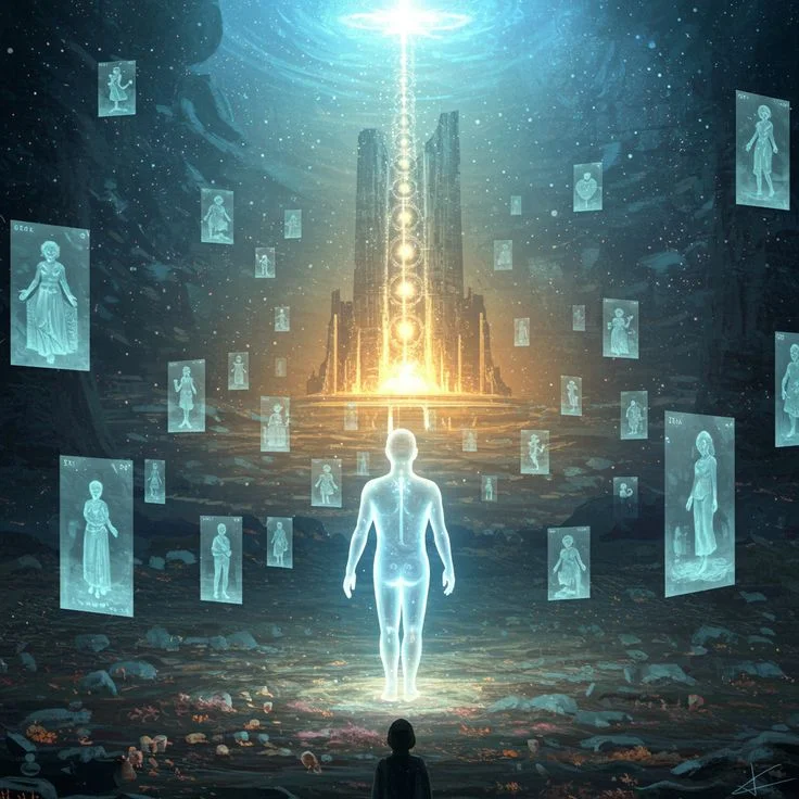Аналогичным образом DES (как эфир разума и мыслей) — это слой информации, в котором отпечатки всех возможных событий фиксируются в виде отпечатков – особых резонансных структур. Его можно рассматривать как своеобразное мнемоническое поле мироздания. Там будущее и прошлое сплетаются в общее поле смыслов, а обитающие там мыслеформы, логоглифы, мнезионы — это семантические узлы, которые связывают разные таймлайны и состояния сознания в единую ткань осознания. Если представить DES как информационное пространство-время, то выбор реальности можно описать как резонансное перемещение между такими узлами, где то, что произойдёт, зависит от того, что уже запечатлено, и наоборот — прошлое меняет свое наполнение в зависимости от реализованного будущего.